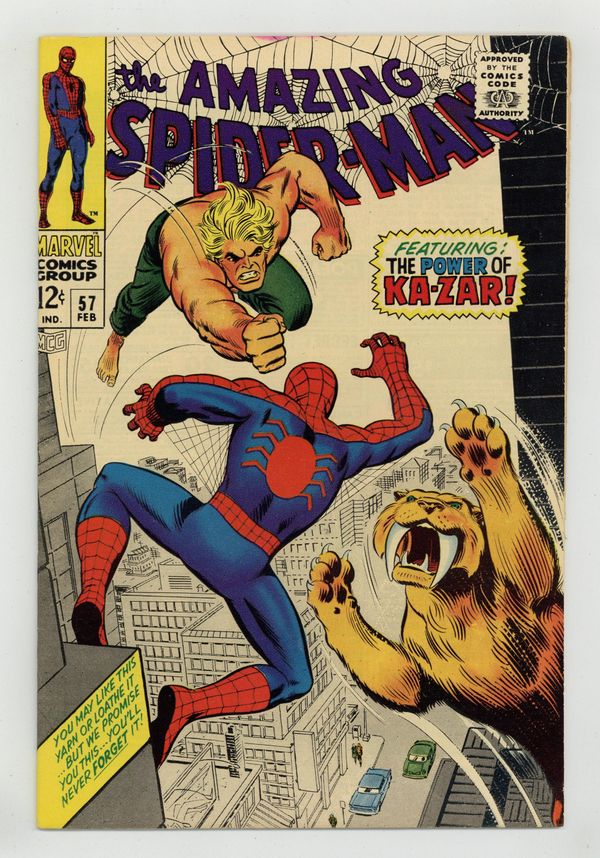 "The Coming of Ka-Zar!" Part 1 of 2. Guest-starring Ka-Zar. Script by Stan Lee. Pencils by John Romita and Don Heck. Inks by Mike Esposito (as Mickey Demeo). Cover by John Romita. The news is good and bad for the Amazing Spider-Man. First the good...the web-slinger helped defeat Doc Oc at the end of last issue. Next the bad...he still has amnesia! So the wondrous wall-crawler is swinging around Manhattan not knowing who he is or where he lives. What a quandary! Meanwhile, Lord Kevin Plunder (akaKa-Zar) arrives in New York City with Zabu. And the first person he bumps into is J. Jonah Jameson! True to form JJJ convinces Ka-Zar that Spider-Man is a menace! And the Lord of the Jungle sets out to bring the web-slinger to justice! When Ka-Zar finds the web-spinner...the rhubarb begins! Atfirst Spider-Man has the advantage, but then the big cat enters the fray! Will Zabu send the wall-crawler to a watery grave? Cameo appearances by Aunt May, Anna Watson, John Jameson, Captain Stacy, Gwen Stacy, and Harry Osborn. (Notes: This issue is the first meeting between Spider-Man and Ka-Zar. The letters page includes a letter from comics historian Peter Sanderson.) 36 pages. Cover price $0.12. Grade: FN+ 6.5 explanation of grade Condition: Used (collectible)