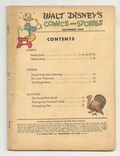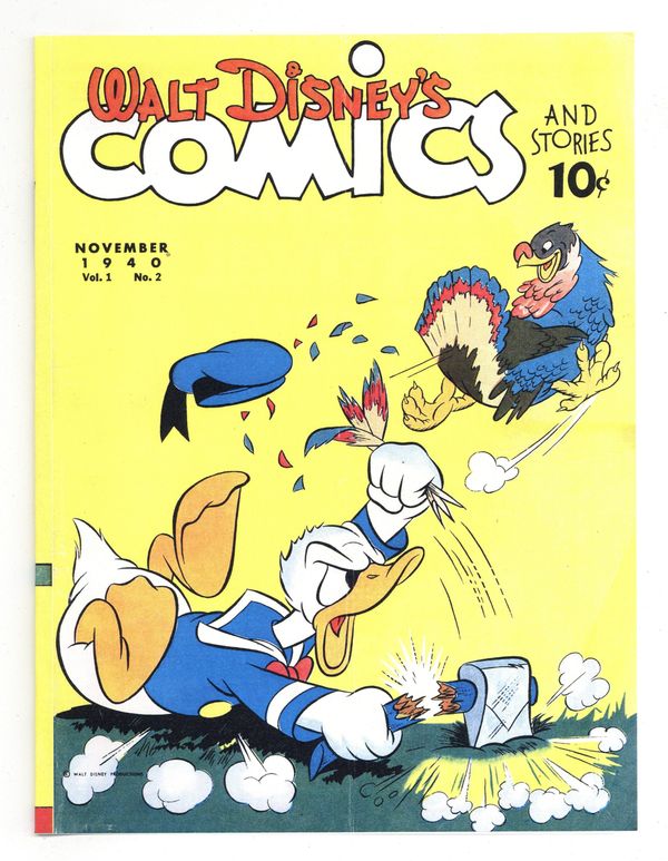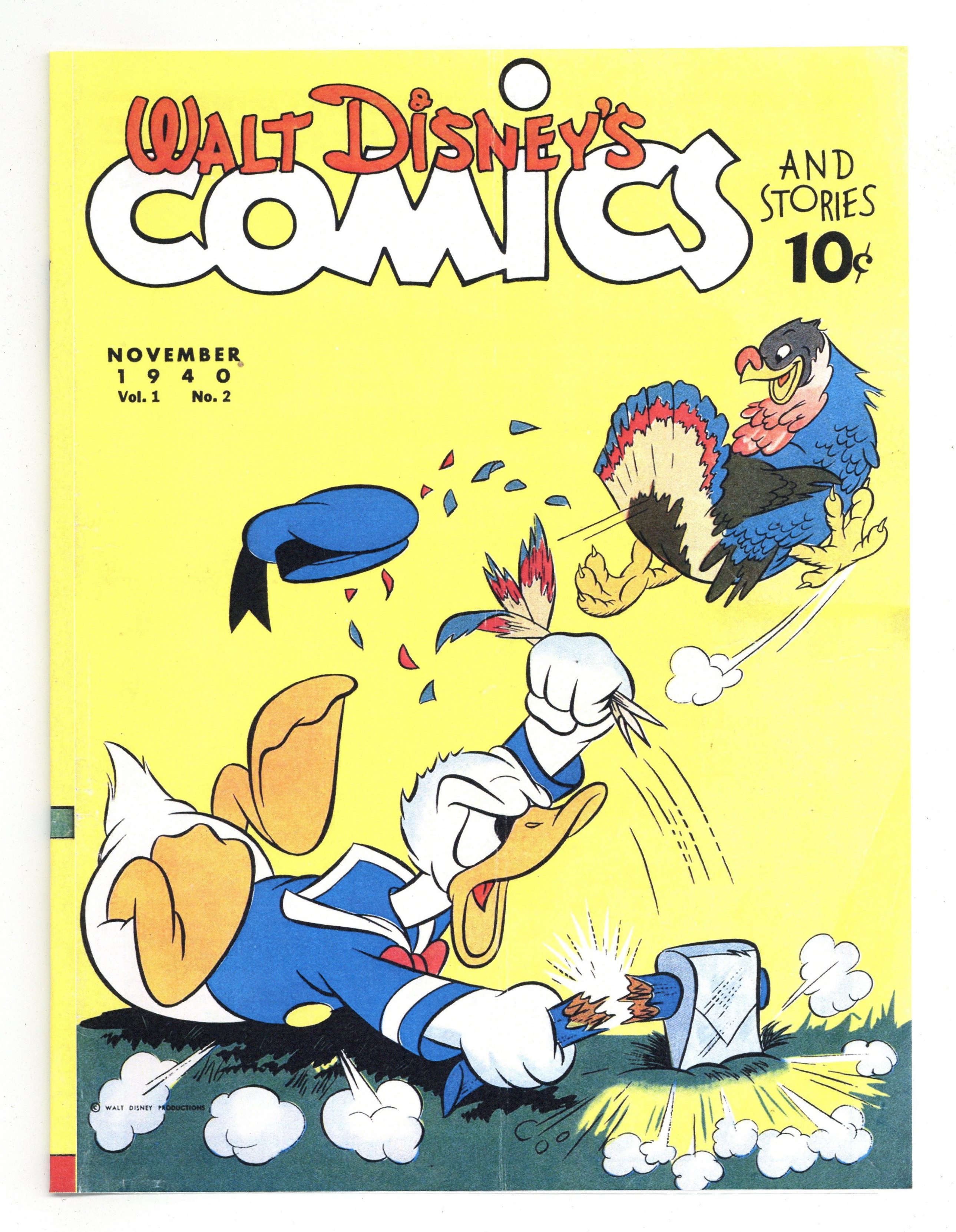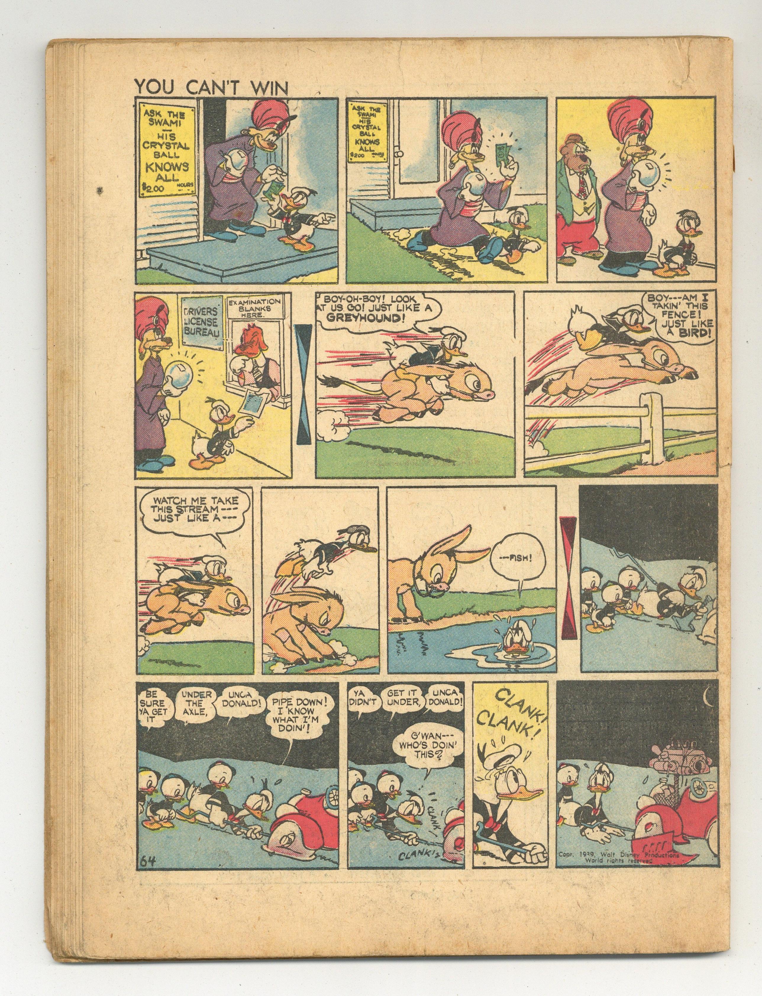 Stories and art by Floyd Gottfredson, Ted Thwaites, Bob Karp, Ted Osborne, and Al Taliaferro. Sometimes listed as Vol. 1, #2. The long-running vehicle for Disney character comics featured early work by Carl Barks, the legendary Good Duck Artist. In the conclusion of a classic Floyd Gottfredson story from the Mickey Mouse comic strip, Mickey and Goofy are captured along with Professor Einmug, while Pegleg Pete seeks the secrets of the floating island in the sky. But Einmug's booby traps will destroy the island – and the four of them with it! In another Gottfredson story, Mickey gets a pet ostrich, but that's waaaay more trouble than he expected. Donald and his nephews test out the saying, Don't put all your eggs in one basket. Plus a text story based on the classic Mickey cartoon The Little Whirlwind. Dizzy Business; Three Guesses; Back To Nature; Two Hits! One Error!; Oh, Nuts!; Donald Duck Goes A-Scouting; Daring Donald; A Slick Customer; Donald Fights Back; Campers Courageous; Try, Try, Again; Backfiring Inventions; Beating Around The Bush; And Now, the Donald Duck Doodle; The Little Whirlwind; Framed!; Donald Grows Wise; Fun at Home; The Flying Mouse; One Never Knows; Great Ideas, But...; Double Trouble; It's A Hard Life; Causes For Complaint; Thanksgiving Day; You Can't Win. 64 pages, Full Color. Cover price $0.10. Grade: Coverless explanation of grade Condition: Used (collectible)