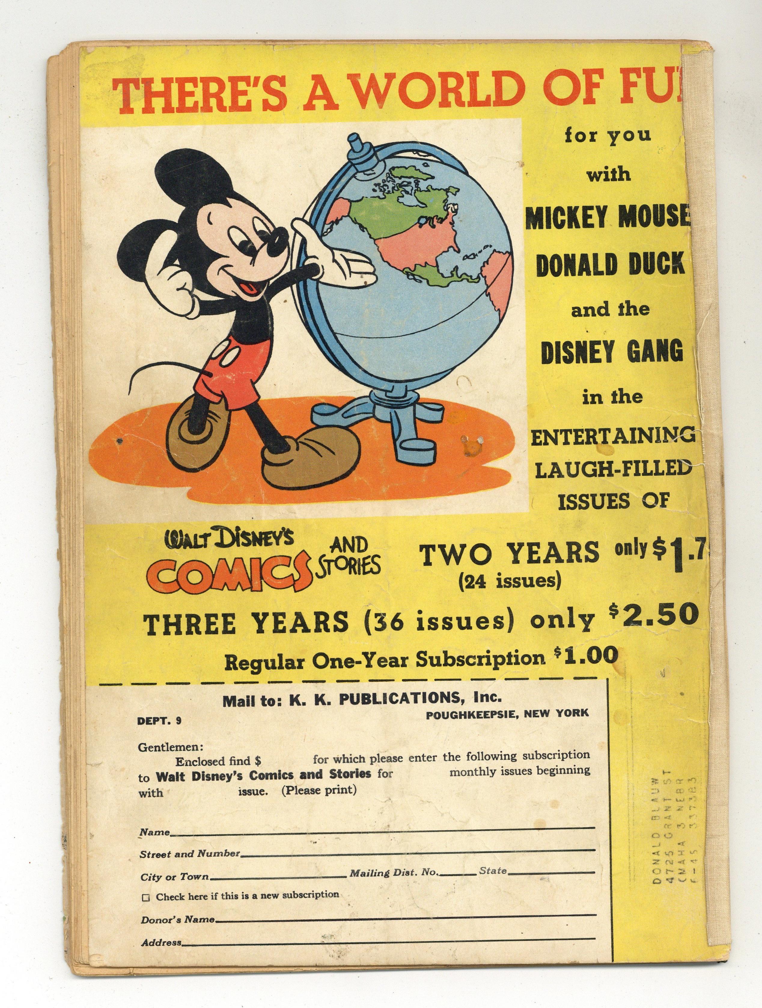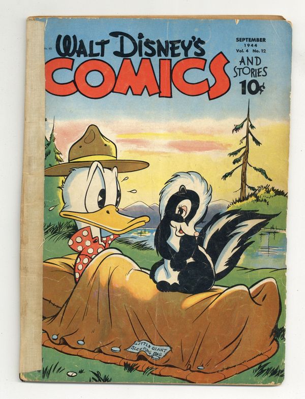 Cover by Walt Kelly. Stories and art by Carl Barks, Floyd Gottfredson, Dick Moores, Bill Walsh, Bob Karp, Hubie Karp, George Waiss, Veve Risto, Manuel Gonzales, Sylvia Holland, Bill Wright, and Al Taliaferro. Sometimes listed as Vol. 4 #12. The long-running vehicle for Disney character comics featured work by Carl Barks, Floyd Gottfredson, and Pogo's Walt Kelly. In a classic Floyd Gottfredson story from the Mickey Mouse comic strip, Mickey has a midair battle with Pete on the wings of the experimental plane. In a story by Barks, Donald gets into a putty-slinging contest with Neighbor Jones. In a story that shares a title with a famous WWII song and Disney cartoon, Der Fuehrer's Face, Donald covers a picture of Hitler with US war bonds. Adorable cover by Walt Kelly. Donald Duck; Bucky Bug; José Carioca; Mickey Mouse; Right in Der Feuhrer's Face!; Oink! Oink!; How to Play Football; An Un-helping Hand!; Music for the Masses!; Caught in the Stampede!; Mickey Mouse: On a Secret Mission; Lesson To Be Continued!; Hook, Line and Sinker! 48 pages, Full Color. Cover price $0.10. Grade: GD- 1.8 explanation of grade Condition: Used (collectible)