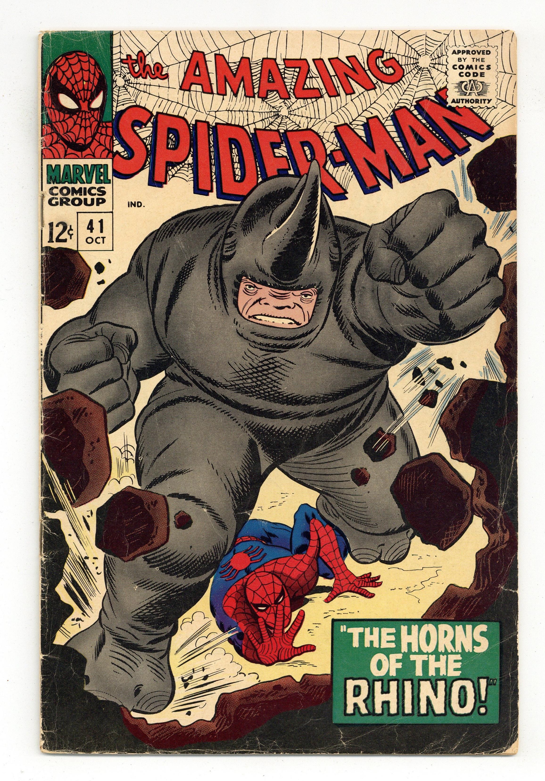 Cover pencils by John Romita Sr., inks by Mike Esposito and John Romita (touch-ups). First appearance of the Rhino in The Horns of the Rhino!, script by Stan Lee, pencils by John Romita Sr., inks by Mike Esposito (as M. Demeo) and John Romita Sr. (touch-ups); The Rhino attempts to kidnap John Jameson to turn him over to foreign powers that want his secrets about the U.S. space program; Spider-Man manages to stop the Rhino. Reprinted in Marvel Tales # 30 and 190. 36 pgs., full color. $0.12. Cover price $0.12. Grade: GD/VG 3.0 explanation of grade Condition: Used (collectible)