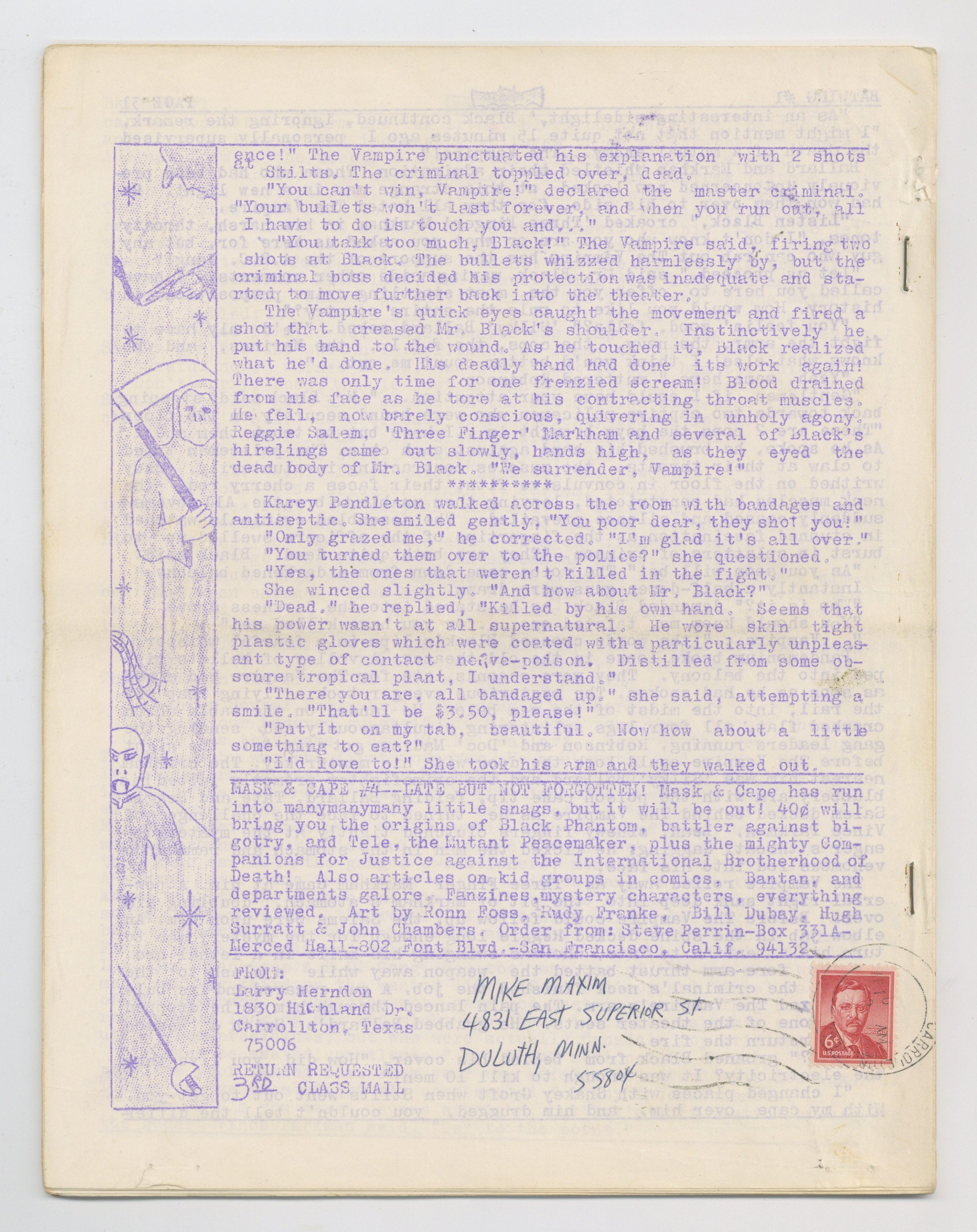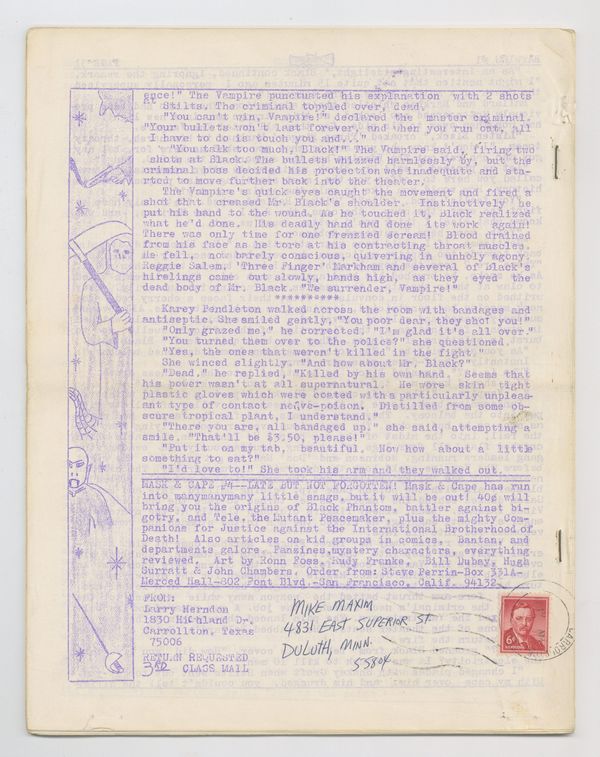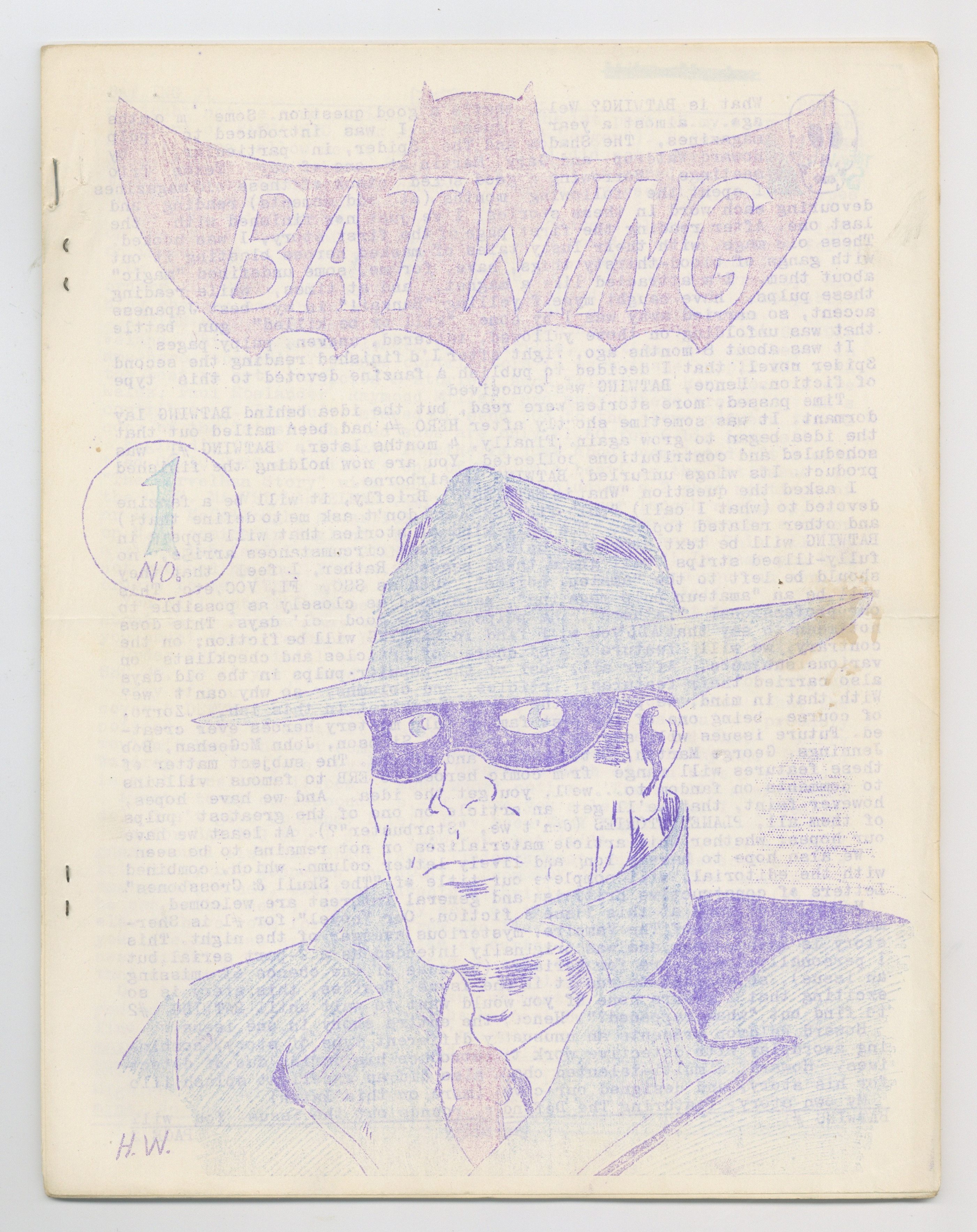 Edited and published by Texas Trio member Larry Herndon, Batwing is a pulp fiction publication from the golden age of fanzines. This issue features: a Shadow cover by Howard Waldrop; "What is Batwing" by Herndon; a Zorro checklist; ads for various comic book fanzines; "Menace of the Black Swastika" Defender story with art by Bill Dubay; "The Affair of the Countess' Jewels" written and illustrated by Howard Waldrop; Mr. Justice pinup by Howard Keltner; and "The Vampire" story by Sherman Howard. Full page ad for Star-Studded Comics #4 and #5. 32 pgs, ditto. March, 1965. 35-cent cover price. Cover price $0.35. Grade: VG 4.0 explanation of grade Condition: Used (collectible)