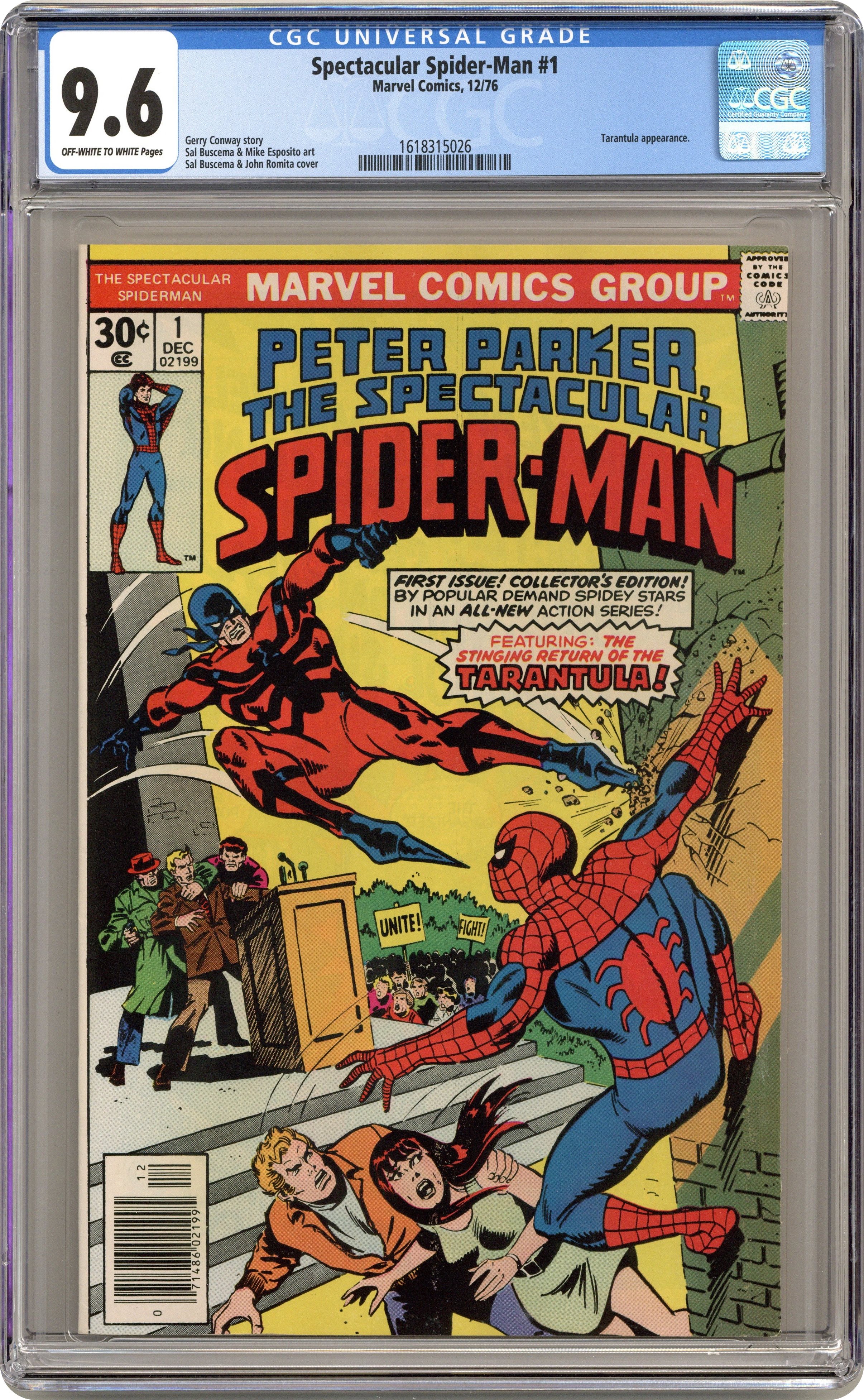 "Twice Stings The Tarantula!" Part 1 of 3. Script by Gerry Conway. Pencils by Sal Buscema. Inks by Mike Esposito. Cover by Sal Buscema and John Romita. The first issue of a brand new series for Spider-Man! The story opens with a bang as the Tarantula kidnaps the Empire State University vice-chancellor, despite the best efforts of the web-slinger, Flash Thompson, and Mary Jane Watson! Next, the Tarantula tries to kill the mayor, but this time the Spectacular Spider-Man is ready! Can the wall-crawler beat the Tarantula and save Mayor Abe Beame? First appearance of Edward Lansky (aka Lightmaster). (Notes: The Spectacular Spider-Man series became the third monthly title for Spider-Man. The first issue of the series debuted the same month as Amazing Spider-Man 163 and Marvel Team-Up 52. The letters page contains an essay from Gerry Conway describing the plans for the new Spider-Man title.) 32 pages Cover price $0.30. Grade: CGC 9.6 explanation of grade Condition: Used (collectible)