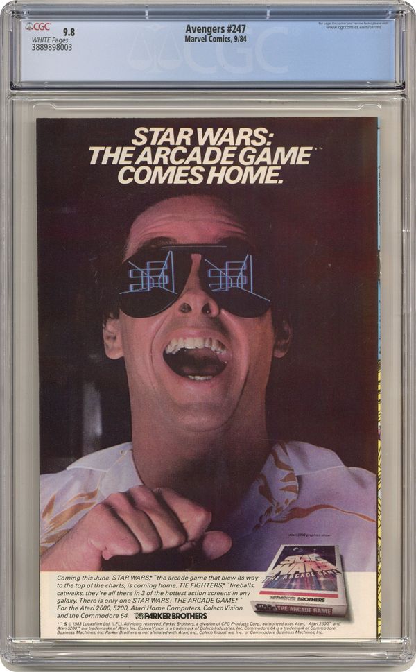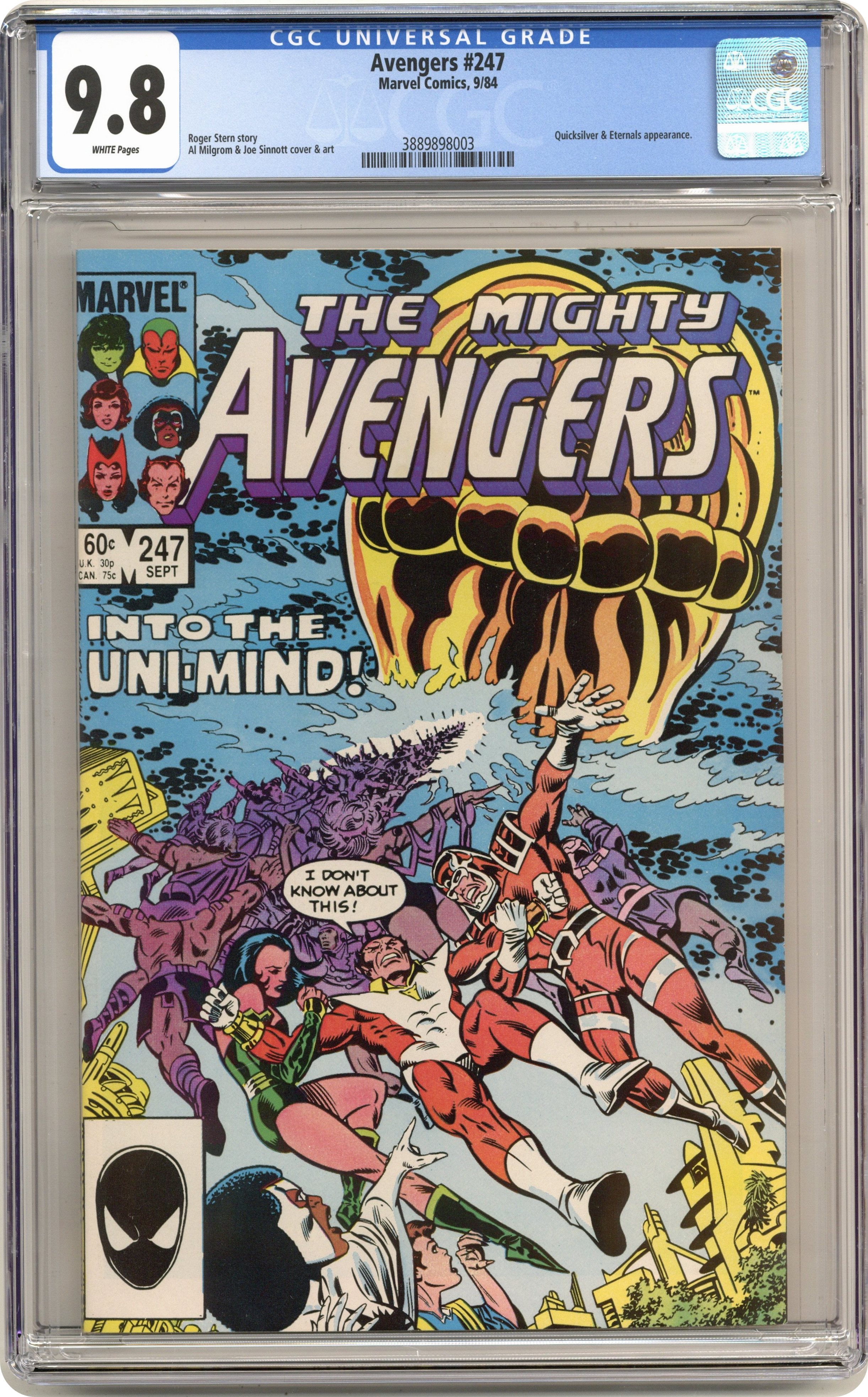 Direct Edition. "The Ties that Bind!" Part 2 of 3. Guest-starring the Eternals. Script by Roger Stern. Art by Al Milgrom (breakdowns) and Joe Sinnott (finishes). Cover by Al Milgrom and Joe Sinnott. In Northern Greece the Wasp and Starfox wake up in the company of the Eternals! Last issue's battle was a huge misunderstanding! And now Starfox learns that he is also an eternal! But that revelation means he must participate in the ritual of the Uni-Mind! In spectacular fashion, all of the Eternals including Starfox take to the sky and become the single entity known as the Uni-Mind! Leaving the Wasp and Captain Marvel gasping in awe! One potential problem though...what if a super-villain were to attack Olympia, while the Eternals are formed in the Uni-Mind? Look out! Retelling of the Eternals' origin. Cameo appearances by She-Hulk, Quicksilver, Lockjaw, and Maelstrom. Flashback cameos by Chronos, Zuras, Mentor, Sui-San, and Thanos to recap the history of Titan; and Magneto, Modred, and Bova to recap the events of the Vision and the Scarlet Witch Limited Series (1st series) issue 4. (Notes: Maelstrom previously appeared in Marvel Two-in-One 72. This issue includes a full-page ad for the first issue of the West Coast Avengers Limited Series.) 36 pages Cover price $0.60. Grade: CGC 9.8 explanation of grade Condition: Used (collectible)