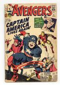 Cover pencils by Jack Kirby, inks by George Roussos. Captain America Joins... The Avengers!, script by Stan Lee, pencils by Jack Kirby, inks by George Roussos; Namor attacks a group of eskimos and throws their idol into the sea. When the ice melts, the figure trapped within turns out to be Captain America, in suspended animation since the end of World War II; The Avengers rescue Cap and return to New York. An alien figure turns our heroes to stone. When Cap and Rick Jones track him down, the alien agrees to restore the Avengers if they agree to help him recover his broken space ship in return; When doing so, the Avengers are attacked by Namor. Roster includes: Thor, Giant-Man, Wasp, Iron Man and Captain America. Rick Jones and Sub-Mariner appearances. First modern appearances of Captain America and Bucky. First appearance (shadowed cameo of face) of the first Baron Zemo. 36 pgs. $0.12. Cover price $0.12. Grade: GD 2.0 explanation of grade Condition: Used (collectible)