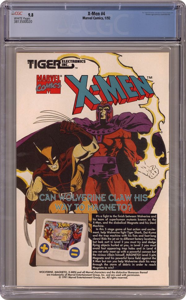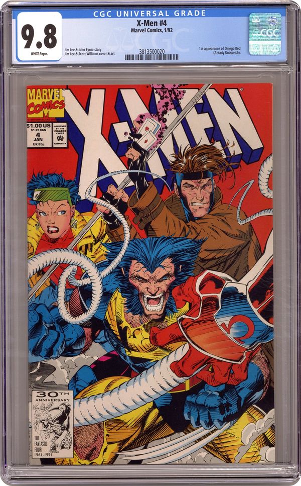 Direct Edition. Cover pencils by Jim Lee, inks by Scott Williams. The Resurrection and the Flesh, script by Jim Lee (Plot) and John Byrne, pencils by Jim Lee, inks by Scott Williams. First appearance of Omega Red! The Hand brings Omega Red (formerly Arkady) back to life; The X-Men play basketball, mutant style; Moira agonizes over her part in the Magneto fiasco and leaves; Gambit and Rogue are on the way to a chaperoned date when Omega Red and the Hand interfere. Cover price $1.00. Grade: CGC 9.8 explanation of grade Condition: Used (collectible)