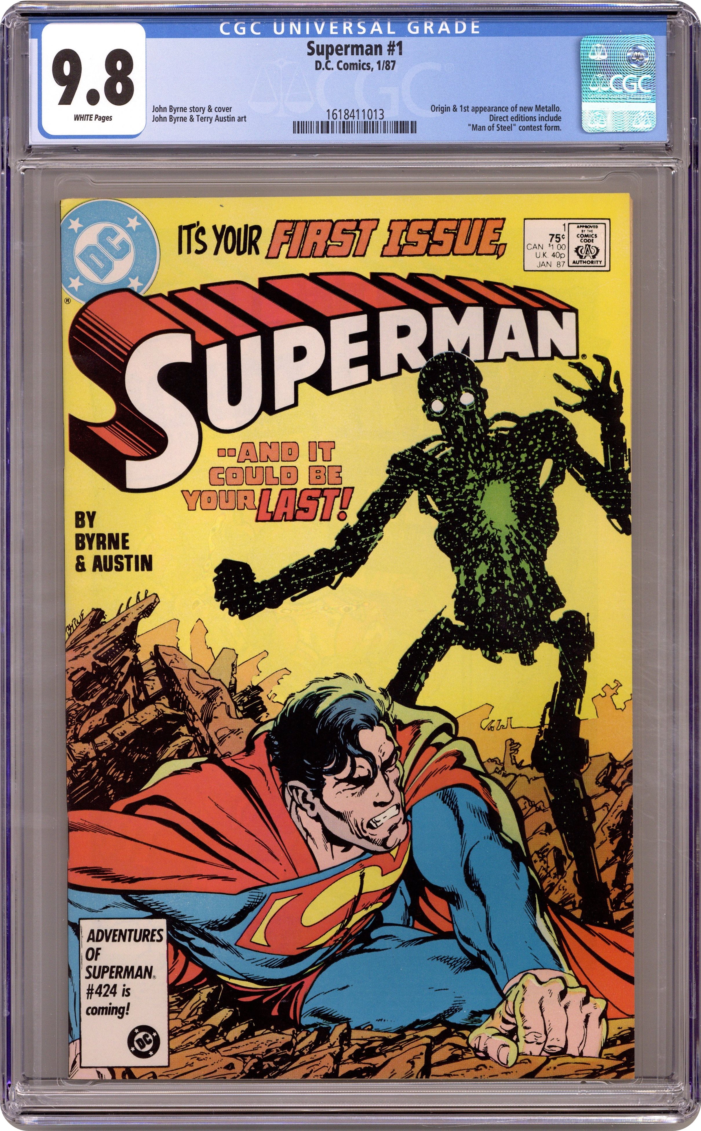 Direct Edition. "Heart of Stone!" Story by John Byrne. Art by John Byrne and Terry Austin. In the wake of Crisis on Infinite Earths, DC decides to revamp and reinvigorate their universe, and their heroes. First up, why none other than the Man of Steel himself. Superstar John Byrne, known for his acclaimed work on Marvel's Uncanny X-Men and the Fantastic Four, re-imagines the Last Son of Krypton for a whole new generation. However, Superman's first issue in this historical relaunch just may be his last as he comes face-to-face with Metallo, the Man with the Kryptonite Heart! Featuring Lois Lane. NOTE: Also see Man of Steel (1986) #1-6 for the lead in story to this series. Superman was created by Jerry Siegel and Joe Shuster. Cover price $0.75. Grade: CGC 9.8 explanation of grade Condition: Used (collectible)