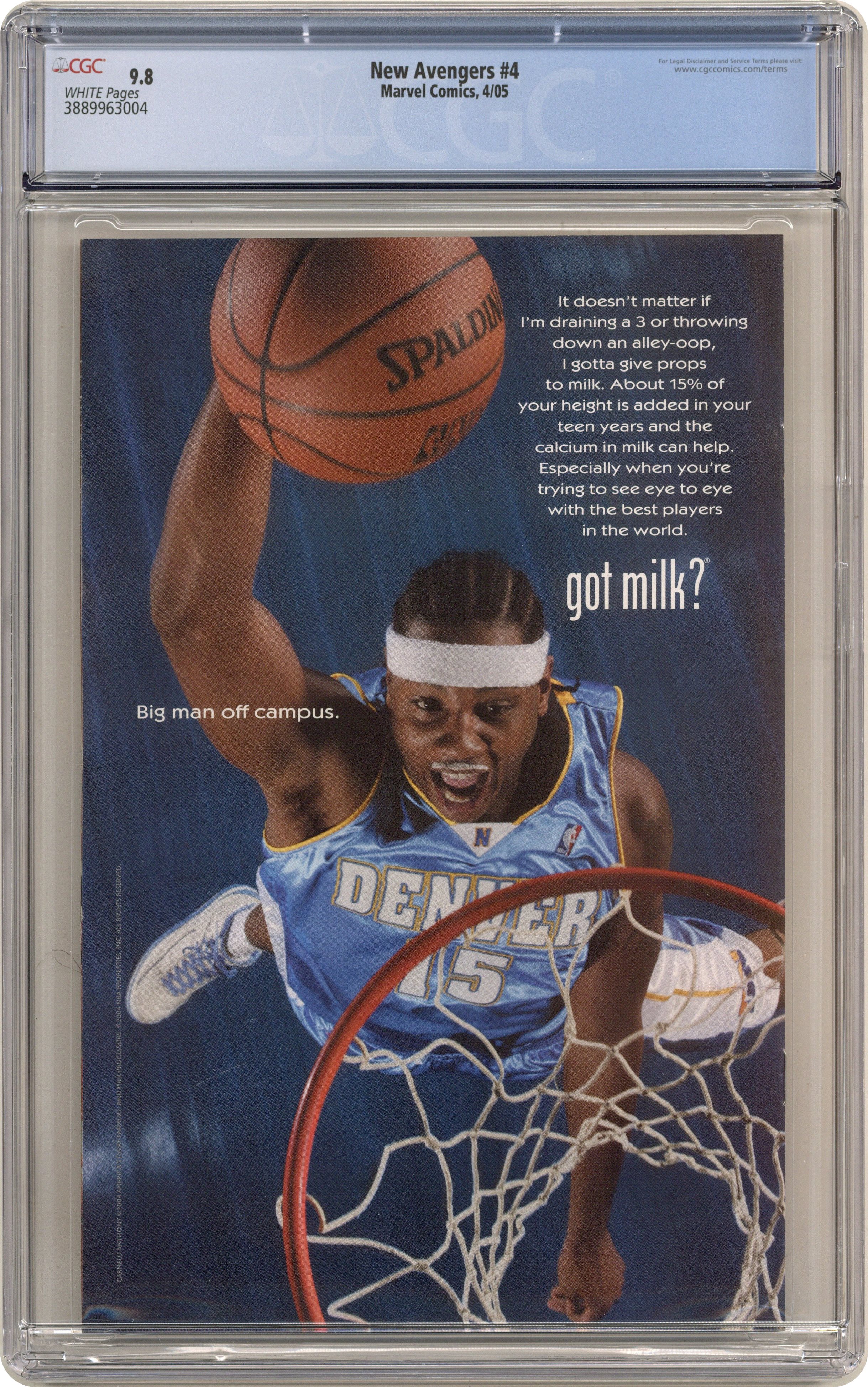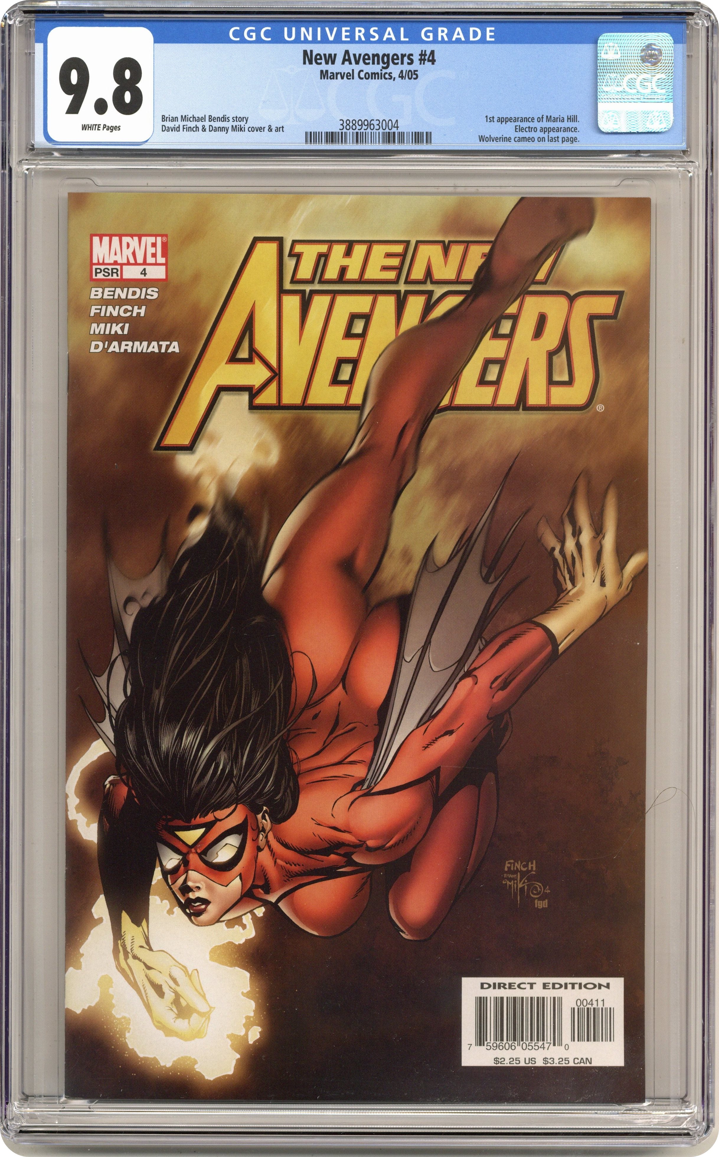 Written by BRIAN MICHAEL BENDIS Pencils & Cover by DAVID FINCH. The New Avengers assemble and come face-to-face with the mystery threat that brought them together in the first place. Plus ? it's unbreakable shield versus adamantium claw. Who will win? It's wall-to-wall crazy! And thanks to you, it's the biggest comic of 2005. 32 PGS./Marvel PSR ...$2.25 Cover price $2.25. Grade: CGC 9.8 explanation of grade Condition: Used (collectible)
