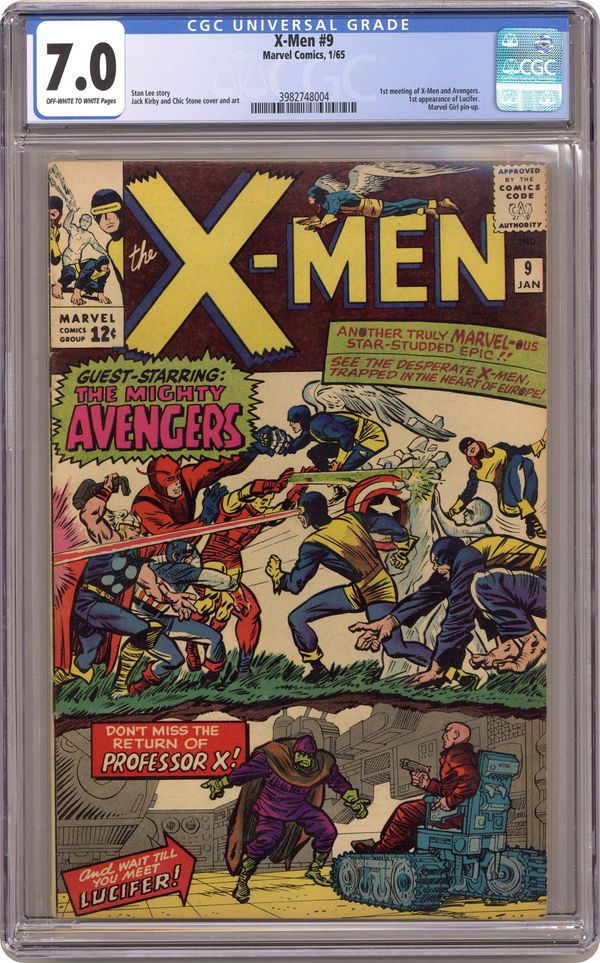 Ended Oct 13 2023 Winning Bid $810 "Enter, The Avengers!" Script by Stan Lee, pencils and cover by Jack Kirby with inks by Chic Stone. 1st meeting of X-Men and the Avengers, 1st appearance of Lucifer. Also features a Marvel Girl "Marvel Masterwork" pin-up with pencils by Kirby and inks by Chic Stone. 36 pgs. Cover price $0.12. Grade: CGC 7.0 explanation of grade Condition: Used (collectible)