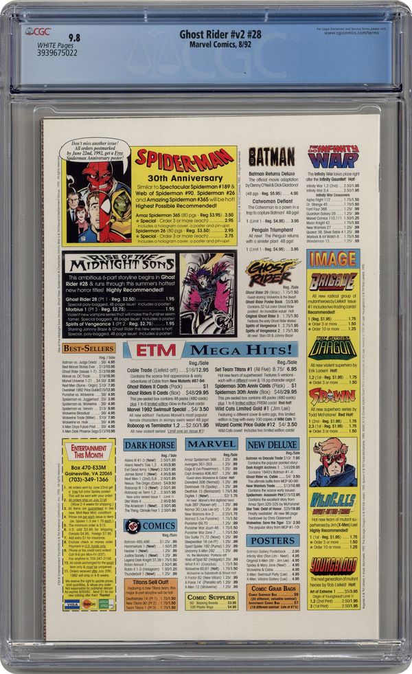 Ended Jun 10 2024 Winning Bid $56 Direct Edition. Rise of the Midnight Sons: Part 1 of 6 - " Visions!" Guest-starring Doctor Strange. Written by Howard Mackie. Art by Andy Kubert and Joe Kubert. Ghost Rider captures two criminals who murdered an elderly woman and deposits them in the mausoleum where he has kept Blackout, Stern, and dozens of other criminals captive. At the Ketch house, Stacy and Gerard Dolan console Francis Ketch over Dan's disappearance. Dolan then gets a call that the police are about to arrest Ghost Rider and leaves to assist. At the cemetery, a man calling himself the Caretaker greets Johnny Blaze and Ghost Rider and tells them the police have surrounded the cemetery. Ghost Rider opens the mausoleum to find all of his captives dead, and, within the void, Dan's spirit experiences a vision given to him by Lilith of an assemblage of supernatural heroes. Blackout and Stern emerge from the crypt and Blackout bites Ghost Rider, causing to experience Lilith's vision as well. Blackout realizes Lilith is his mother and vows to find her. Blackout and Stern flee the mausoleum amidst police gunfire. Michael Badilino, the officer in charge, enters the mausoleum to arrest Ghost Rider, but Caretaker hits him with a shovel and leads Ghost Rider and Blaze through underground tunnels to an unoccupied section of the cemetery. Blackout attempts to flee on a bike Blaze stored in the cemetery, but flees on foot when Blaze sets the bike ablaze hellfire. Blaze, on the flaming bike, and Ghost Rider leave to meet with the Quentin Carnival in Rhode Island, and Caretaker asks the arriving Doctor Strange if he believes he can defeat Lilith. Story continues in Ghost Rider/Blaze: Spirits of Vengeance (1992) #1. 32 pages, FC. Cover price $2.50. Grade: CGC 9.8 explanation of grade Condition: Used (collectible)