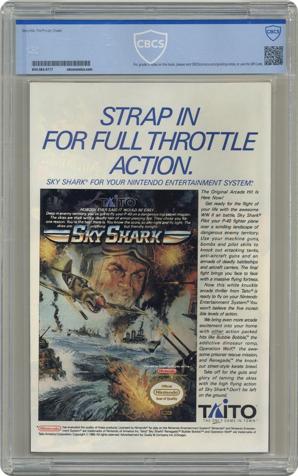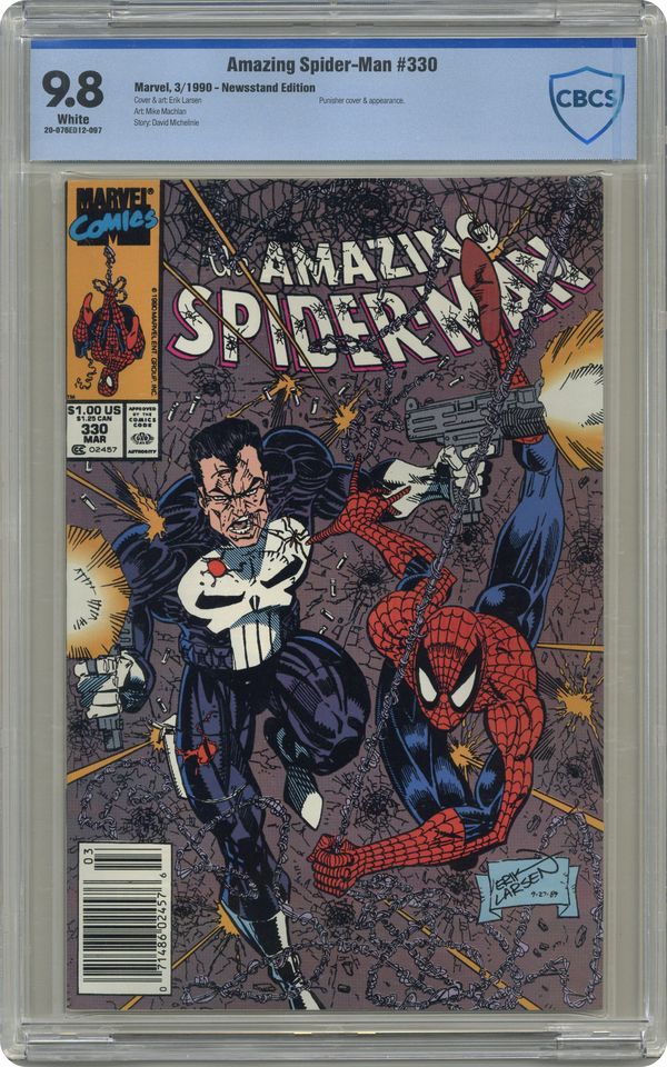 First Printing. Direct Edition. "The Power Chase" Part 1 of 2. Guest-starring the Punisher. Script by David Michelinie. Pencils by Erik Larsen. Inks by Mike Machlan. Cover by Erik Larsen. The War on Drugs comes to the pages of the Amazing Spider-Man! As the web-slinger and the Punisher team up to track down a massive cocaine shipment coming into the Big Apple! On the Brooklyn docks, the wall-crawler and the gun-toting vigilante find what they're looking for in droves! The duo is not surprised that the coke is heavily guarded; however, they're shocked it's protected by the U.S. military! Are the feds dealing? Or perhaps better stated...double-dealing? Cameo appearances by Aunt May, Microchip, and Eddie Brock (aka Venom). Flashback cameos by Mary Jane Watson, Flash Thompson and the Black Cat. (Notes: There exists a JCPenney reprint of this issue (published in 1993) which can be identified by the words "The Amazing Spider-Man" in the UPC box on the front cover.) 36 pages Cover price $1.00. Grade: CBCS 9.8 explanation of grade Condition: Used (collectible)