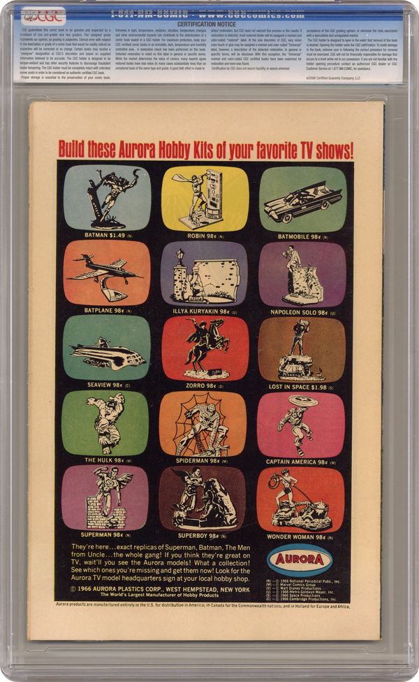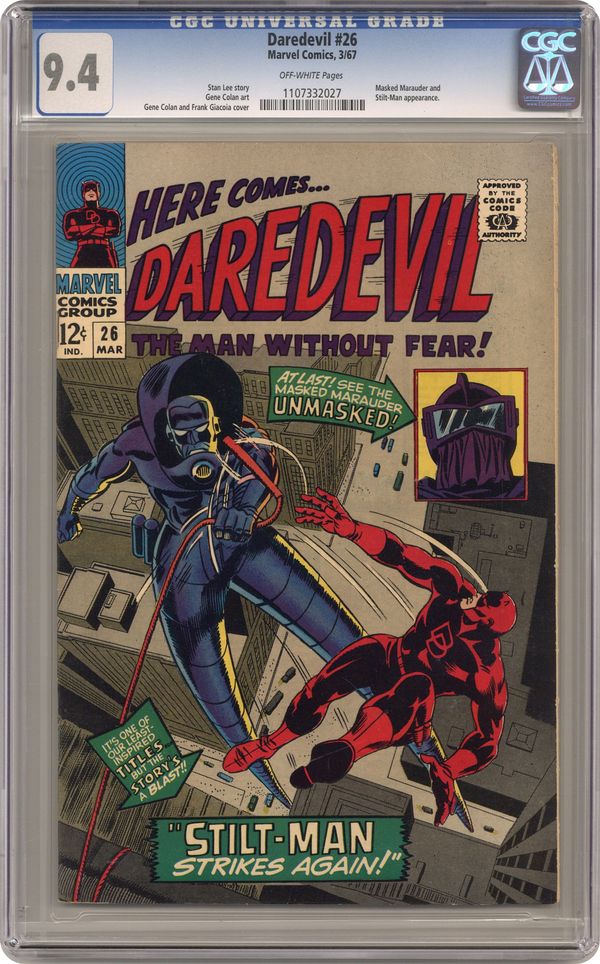 Cover pencils by Gene Colan, inks by Frank Giacoia. Stilt-Man Strikes Again, script by Stan Lee, art by Gene Colan; Matt continues in his role as Mike Murdock, Daredevil supreme; The Leap-Frog hops away from his trial and when DD goes after him, he runs across Stilt-Man; The Masked Marauder searches for DD's secret identity and rescues Stilt-Man from Hornhead. 32 pgs. Cover price $0.12. Cover price $0.12. Grade: CGC 9.4 explanation of grade Condition: Used (collectible)