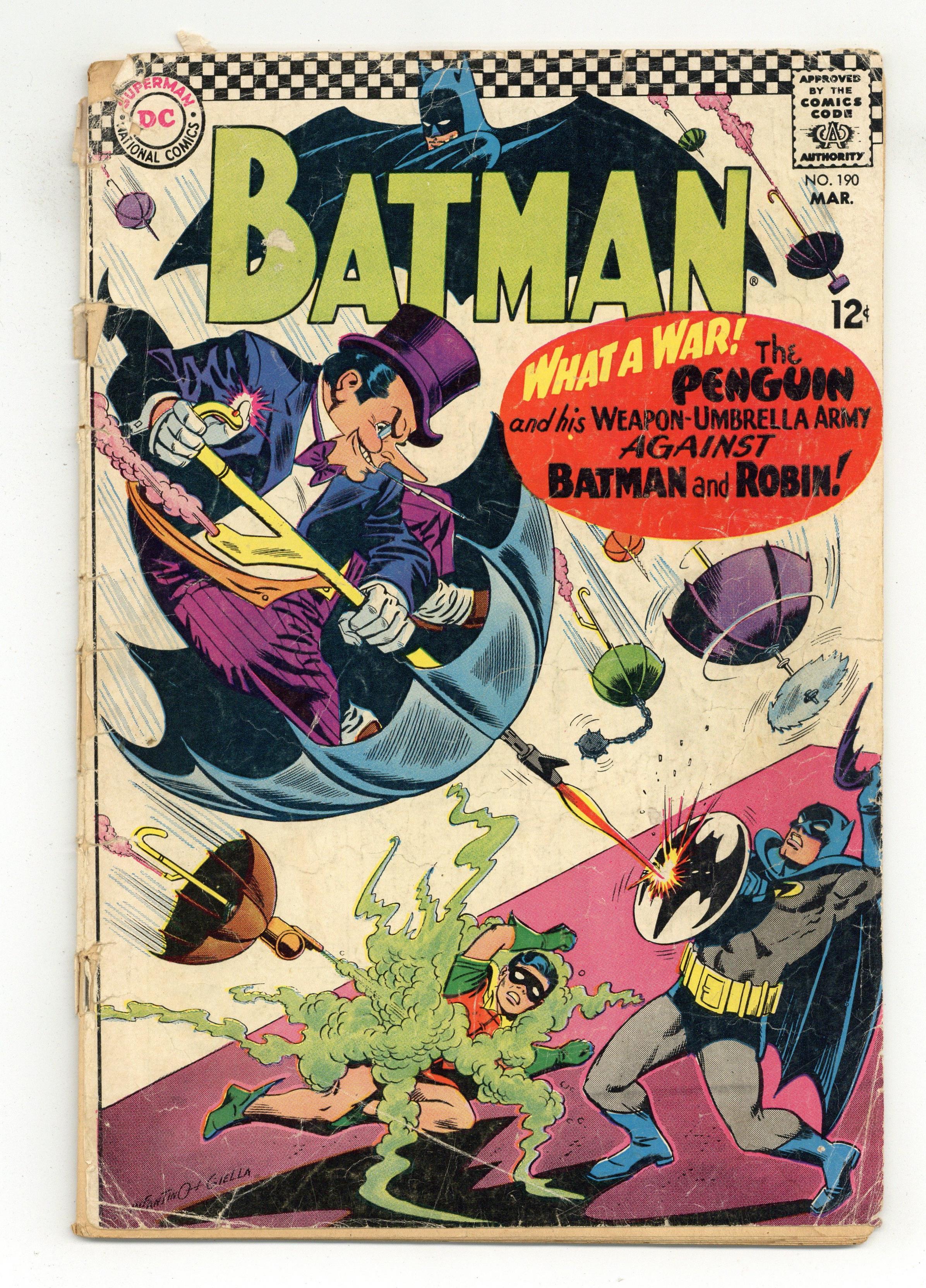 Cover pencils by Carmine Infantino, inks by Joe Giella. "The Penguin Takes a Flyer--Into the Future!", script by Gardner Fox, pencils by Sheldon Moldoff (as Bob Kane), inks by Joe Giella; Penguin attempts to fool the Caped Crusaders into believing that his new tricks are based on futuristic technology. When this fails and his gang is captured the Fowl villain begins using robotic umbrellas against the Dynamic Duo. Letters from letter hack Guy H. Lillian III and Marvel colorist and assistant editor Irene Vartanoff. Cap's Hobby Hints activity half-page by Henry Boltinoff. Countdown on Excellence public service, script by Jack Schiff, art by Sheldon Moldoff; Jerry gets a lecture from his father on the importance of doing every job right. 36 Pages, Full Color. Cover price $0.25. Grade: FR/GD 1.5 explanation of grade Condition: Used (collectible)
