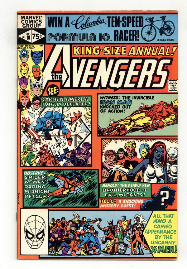 Direct Edition. First appearance of Rogue and Madelyne Pryor in "By My Friends Betrayed!" Spider-Woman, X-Men, Carol Danvers, and New Brotherhood of Mutants guest star. Script by Chris Claremont. Pencils by Michael Golden. Inks by Armando Gil. Cover by Al Milgrom. This action-packed annual has got it all, true believers: the first appearance of Rogue, the spectacular art of Michael Golden, the tragic return of Carol Danvers, and the stupendous struggle between the Brotherhood of Evil Mutants and the mighty Avengers! Following the events of Uncanny X-Men #142, Mystique & her New Brotherhood of Evil Mutants attempt to break four of their members out of Ryker's Island prison! After Rogue and Mystique take down Captain America, Iron Man, and Thor, the rest of the Avengers and Spider-Woman catch up to the villains, and the epic clash erupts! Woven in and around the frantic action at Ryker's Island is the heartbreaking story of Carol Danvers' return to Earth. Her life has fallen apart since leaving for Limbo with Marcus Immortus in Avengers #200, and now, stripped of her powers and memories, Carol begins the long road to recovery. And the first step is an emotional confrontation with her former teammates! Notes: Marvel Super-Heroes #11 (Fall 1992) fills in the details of Carol Danvers' life between Avengers #200 and Avengers Annual #10. The Thing stars in a one-page Hostess ad, "A Lesson to Be Learned!" This issue was reprinted in 1993 in the trade paperback: The Greatest Battles of the Avengers. 52 pages, full color. Cover price $0.75. Grade: FN 6.0 explanation of grade Condition: Used (collectible)