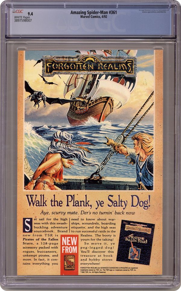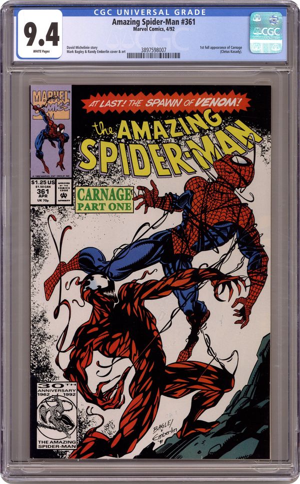 First Printing. Direct Edition. First (full) appearance of Carnage in "Savage Genesis!" Part 1 of 3. Script by David Michelinie. Pencils by Mark Bagley. Inks by Randy Emberlin. Cover by Mark Bagley and Randy Emberlin. Blood runs in the streets as a serial killer roams New York City! And as the web-slinger investigates the murders, he notices a very disturbing similarity to another killer's modus operandi! In a burned-out building in Brooklyn, the spectacular one comes face-to-face with his new homicidal foe...Carnage! Can the wall-crawler end Cletus Kasady's rampage in their very first encounter? Cameo appearances by Aunt May and Mary Jane Watson. Flashback cameo by Venom. (Note: This three-part story was reprinted in 2011 in the trade paperback: Spider-Man -- The Vengeance of Venom.) 36 pages, full color. $1.25 cover price. NOTE: Most of these were distributed with slight printer tears in the bottom edge of the cover. Cover price $1.25. Grade: CGC 9.4 explanation of grade Condition: Used (collectible)