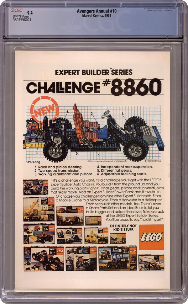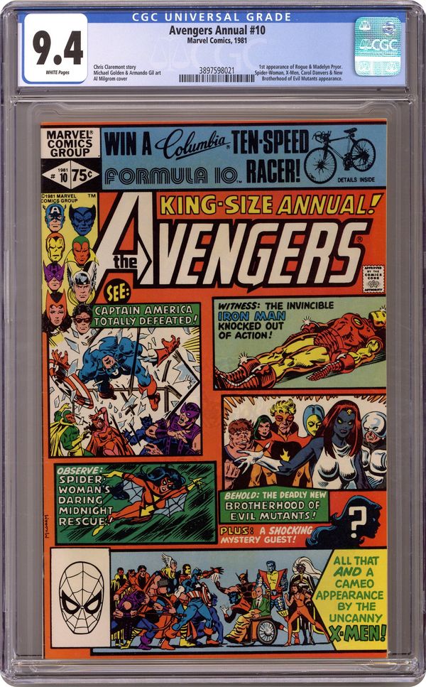 Direct Edition. First appearance of Rogue and Madelyne Pryor in "By My Friends Betrayed!" Spider-Woman, X-Men, Carol Danvers, and New Brotherhood of Mutants guest star. Script by Chris Claremont. Pencils by Michael Golden. Inks by Armando Gil. Cover by Al Milgrom. This action-packed annual has got it all, true believers: the first appearance of Rogue, the spectacular art of Michael Golden, the tragic return of Carol Danvers, and the stupendous struggle between the Brotherhood of Evil Mutants and the mighty Avengers! Following the events of Uncanny X-Men #142, Mystique & her New Brotherhood of Evil Mutants attempt to break four of their members out of Ryker's Island prison! After Rogue and Mystique take down Captain America, Iron Man, and Thor, the rest of the Avengers and Spider-Woman catch up to the villains, and the epic clash erupts! Woven in and around the frantic action at Ryker's Island is the heartbreaking story of Carol Danvers' return to Earth. Her life has fallen apart since leaving for Limbo with Marcus Immortus in Avengers #200, and now, stripped of her powers and memories, Carol begins the long road to recovery. And the first step is an emotional confrontation with her former teammates! Notes: Marvel Super-Heroes #11 (Fall 1992) fills in the details of Carol Danvers' life between Avengers #200 and Avengers Annual #10. The Thing stars in a one-page Hostess ad, "A Lesson to Be Learned!" This issue was reprinted in 1993 in the trade paperback: The Greatest Battles of the Avengers. 52 pages, full color. Cover price $0.75. Grade: CGC 9.4 explanation of grade Condition: Used (collectible)