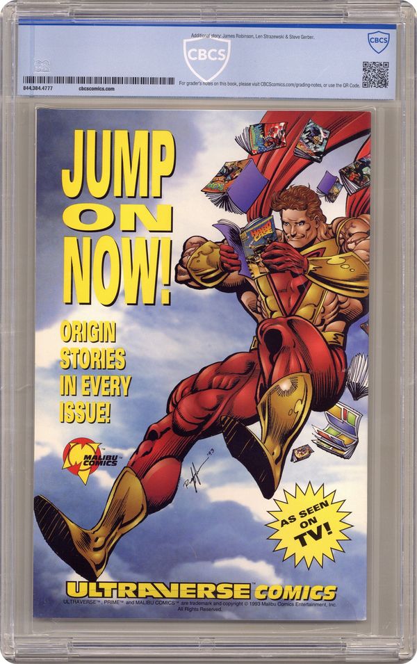 Ended Jun 20 2024 Winning Bid $41 The Secrets of the Ultraverse - Written by Gerard Jones, Mike W. Barr, Steve Englehart, Steve Gerber, James D. Hudnall, Tom Mason, George Perez, James Robinson & Len Strazewski. Art by George Perez & Al Vey. Cover by George Perez. Prime, Hardcase, the Solution, the Strangers, Prototype, Mantra and Choice converge on the Moon to try to solve the mystery behind the origin of all ultras! If they don't solve it in time, life on Earth will be destroyed by the ultraviolet energy exploding from Amber! But Quattro and the Omega Team, serving the mysterious Rex Mundi, are fighting to stop them. Meanwhile, the people of Earth are driven insane by Amber's radiance, which makes trouble for the Night Man, Freex, Firearm, Sludge and Solitaire, and provides food for the vampire-creature Rune. And Warstrike battles Aladdin's Wrath. Also, big answers to the fundamental questions of the Ultraverse! A new dimension opens, changing the Ultraverse forever! 40 pages, full color. Cover price $2.50. Grade: CBCS 9.8 explanation of grade Condition: Used (collectible)