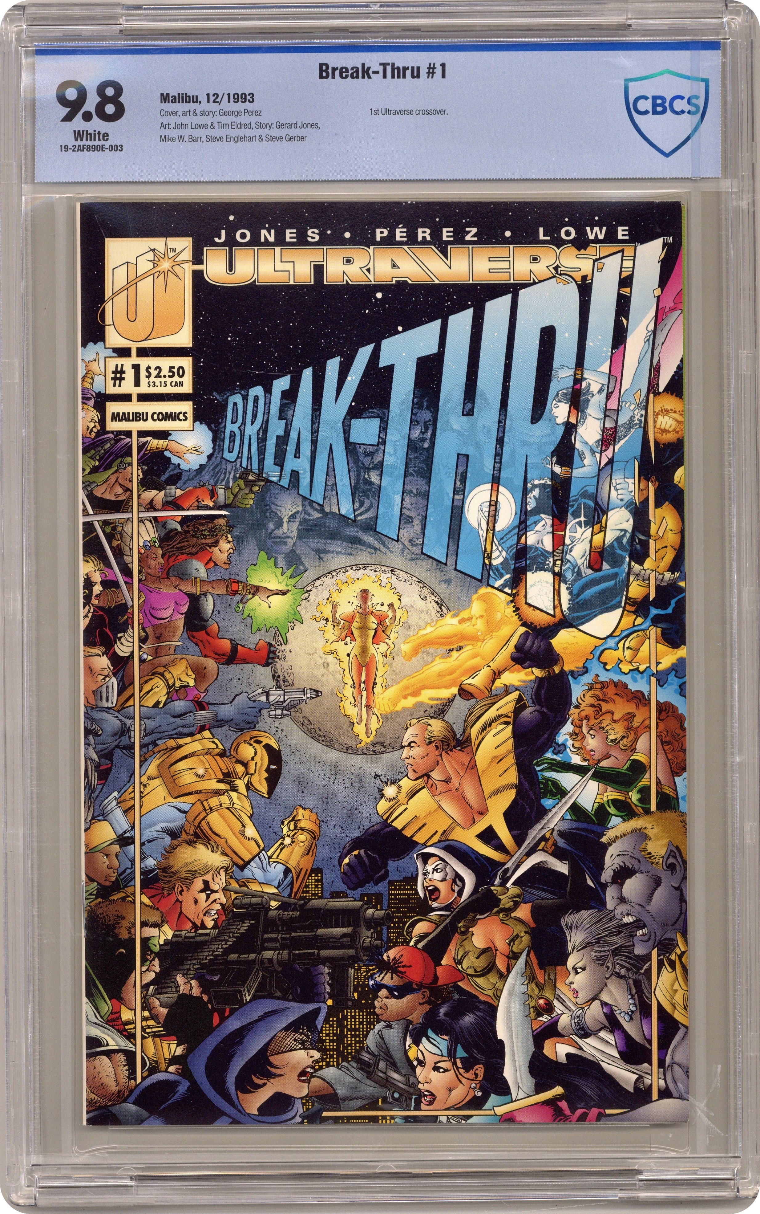 Ended Jun 20 2024 Winning Bid $27 Break-Thru: Part One - Written by Gerard Jones, Mike W. Barr, Steve Englehart, Steve Gerber, James D. Hudnall, Tom Mason, George Perez, James Robinson & Len Strazewski. Art by George Perez, John Lowe and Tim Eldred. Cover by George Perez. The first Ultraverse crossover! Continued from Exiles (1993 1st Series Malibu) #4. This event solidifies Ultraverse continuity and reveals exactly what the creators have been working toward for the last year. The storyline reveals how many ultras came into existence, plus further defines the world in which the characters exist. Break-Thru irrevocably transforms the Ultraverse forever, as readers and ultras alike discover some of the most crucial secrets of this world and those beyond! Characters include Amber, Wrath, Prime, the Solution, Choice, Hardcase, the Strangers, Solitaire, Firearm, the Night Man, Freex, Sludge, Warstrike, Mantra, Prototype, Entity and Dr. Rains. 40 pages, full color. Cover price $2.50. Grade: CBCS 9.8 explanation of grade Condition: Used (collectible)