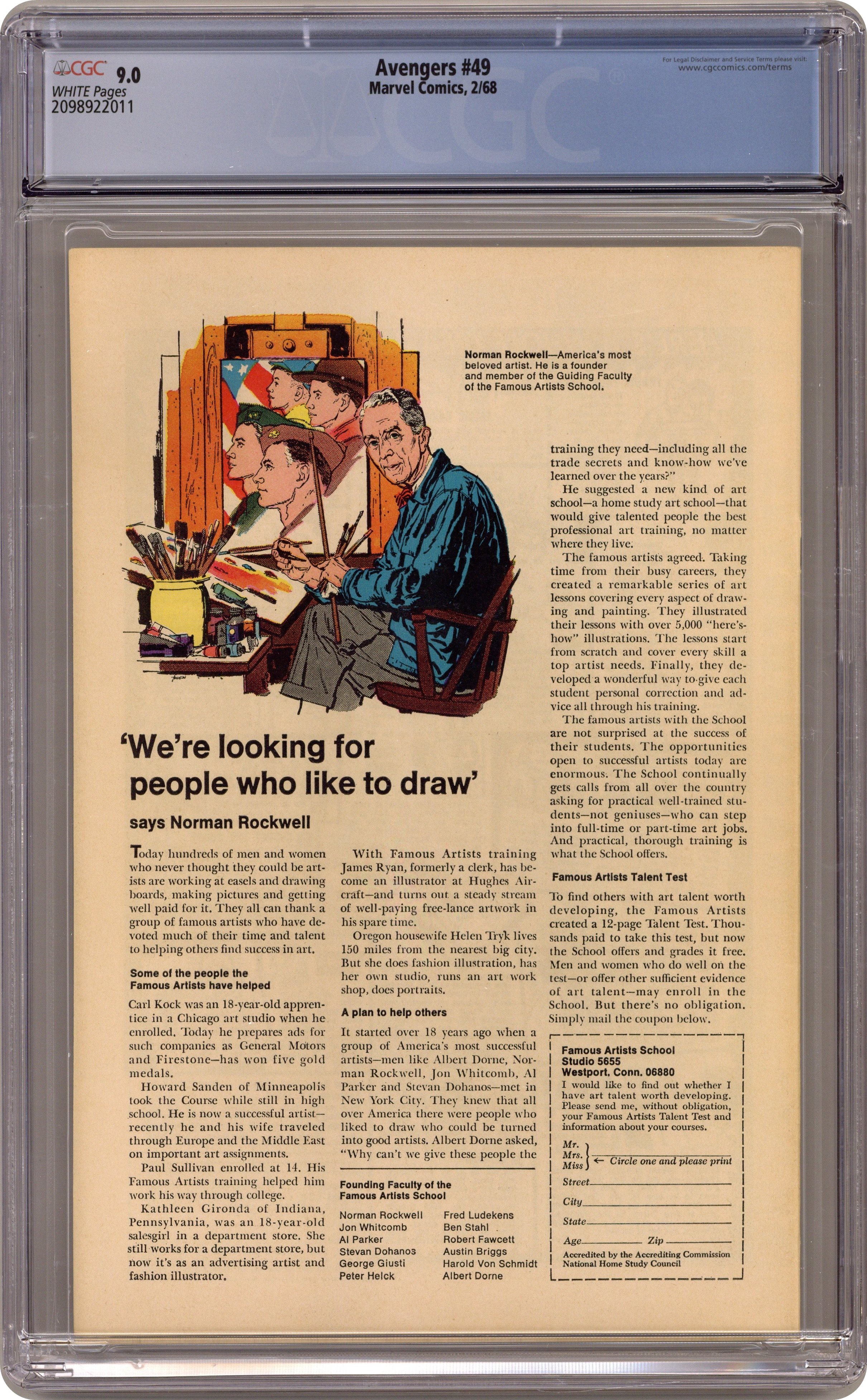 Ended Apr 21 2023 Winning Bid $105 "Mine is the Power!" Script by Roy Thomas. Art by John Buscema. Cover by John Buscema. The Scarlet Witch and Quicksilver escort Magneto to the United Nations Building in New York! The Master of Magnetism wants to tell the world that he seeks peace with mankind. It sounds like such a noble endeavor! But as illustrated on the classic cover, Magneto is secretly pulling all the strings! When a mêlée breaks out inside the General Assembly Hall, Magneto directs a bullet to graze Wanda's head. And that causes Pietro to lash out at everyone...including Earth's Mightiest Heroes! This day has gone from bad to worse in a hurry! In the meantime, on Mount Olympus, Hercules comes face-to-face with the powerful titan that wrecked his homeland and dispatched the gods! First appearance of Typhon. Cameo appearance by the Toad. Flashback cameo by Zeus. Avengers Lineup: Hawkeye, Goliath (aka Hank Pym), Hercules, Quicksilver, Scarlet Witch, and the Wasp. (Notes: Wanda and Pietro's ordeal continues in Uncanny X-Men (1st series) #43. This story was reprinted in Marvel Triple Action #41.) 36 pages. Cover price $0.12. Grade: CGC 9.0 explanation of grade Condition: Used (collectible)