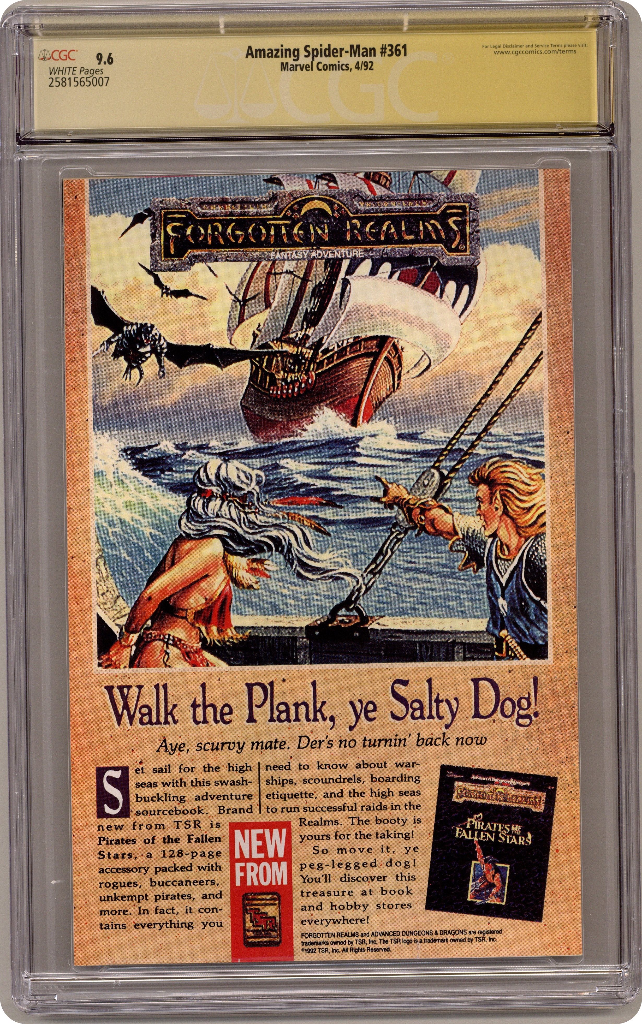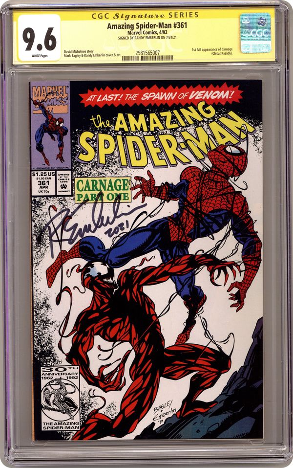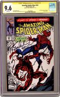 First Printing. Direct Edition. First (full) appearance of Carnage in "Savage Genesis!" Part 1 of 3. Script by David Michelinie. Pencils by Mark Bagley. Inks by Randy Emberlin. Cover by Mark Bagley and Randy Emberlin. Blood runs in the streets as a serial killer roams New York City! And as the web-slinger investigates the murders, he notices a very disturbing similarity to another killer's modus operandi! In a burned-out building in Brooklyn, the spectacular one comes face-to-face with his new homicidal foe...Carnage! Can the wall-crawler end Cletus Kasady's rampage in their very first encounter? Cameo appearances by Aunt May and Mary Jane Watson. Flashback cameo by Venom. (Note: This three-part story was reprinted in 2011 in the trade paperback: Spider-Man -- The Vengeance of Venom.) 36 pages, full color. $1.25 cover price. NOTE: Most of these were distributed with slight printer tears in the bottom edge of the cover. Cover price $1.25. Grade: CGC 9.6 explanation of grade Condition: Used (collectible)