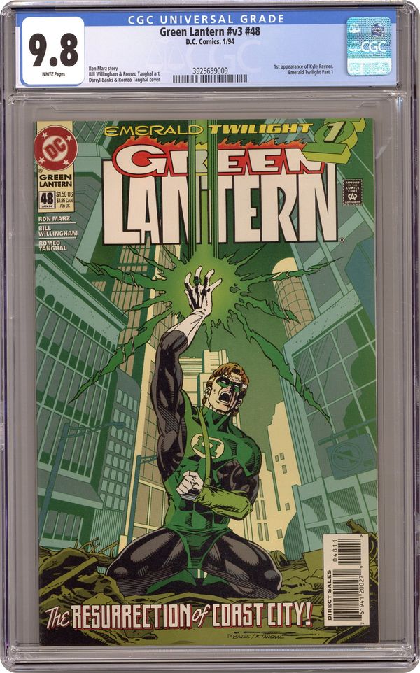 Ended Oct 28 2023 Winning Bid $89 Direct Edition. Emerald Twilight: Part 1 of 3. "The Past!" Story by Ron Marz. Art by Bill Willingham, Robert Campanella, and Romeo Tanghal. It's the beginning of the end for Hal Jordan. In this seminal chapter in the life of Green Lantern, Hal returns to ground zero and attempts to use his Power Ring to resurrect the devastated Coast City. But what happens if he doesn't have enough power? Don't miss the most unexpected turn in the life of Hal Jordan as DC counts down to a very special 50th issue. NOTE: 1st appearance of Kyle Rayner. Cover price $1.50. Grade: CGC 9.8 explanation of grade Condition: Used (collectible)