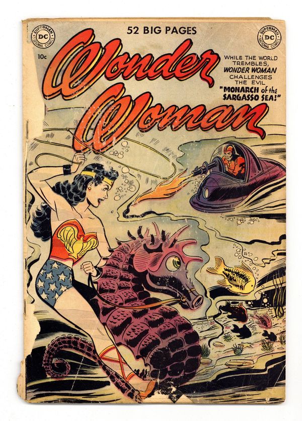 Cover by Irwin Hasen. "The Monarch of the Sargasso Sea" (chapter one), script by Robert Kanigher, art by Harry G. Peter ; Wonder Woman and the Holliday Girls are captured in the Sargasso Sea by Master De Stroyer who has enslaved the Sargasso Sea Kingdom. "Chapter 2: Wonder Woman's Decision," script by Robert Kanigher, art by Harry G. Peter; Dangeress forces Wonder Woman to help her steal an atomic motor. Wonder Women of History: four-page Mary Slessor bio by Julius Schwartz, art by Paul Reinman. "The Astonishing Mr. Franklin" text article by William Irwin. "Chapter 3: The Final Battle of the Sargasso Sea," script by Robert Kanigher, art by Harry G. Peter. 52 Pages, Full Color. Cover price $0.10. Grade: PR 0.5 explanation of grade Condition: Used (collectible)