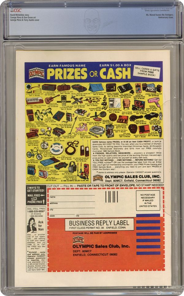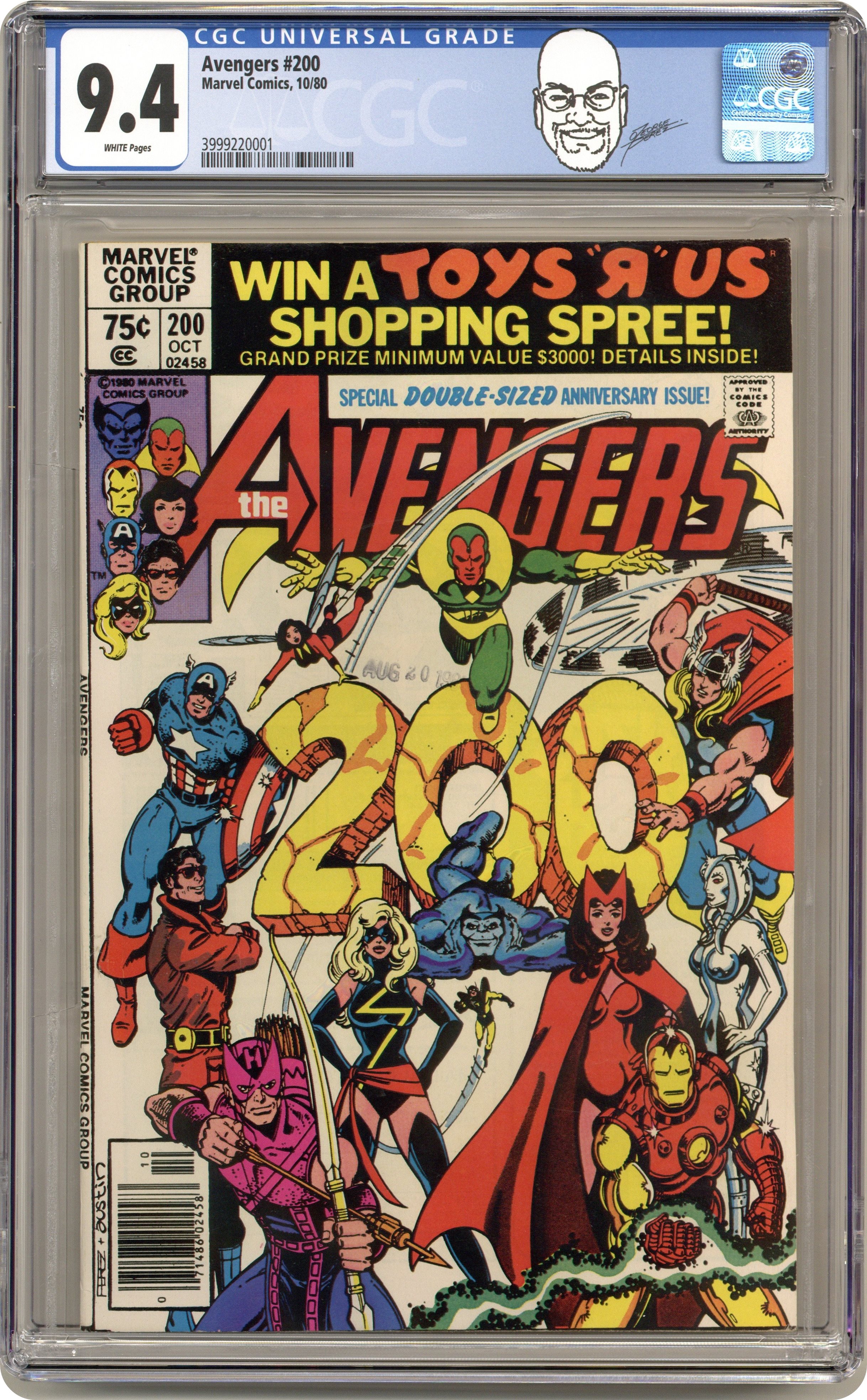 Ended Jan 10 2024 Winning Bid $32 Direct Edition. Special 48-page giant-sized anniversary issue! "The Child is Father to...?" Plot by Jim Shooter, George Perez, Bob Layton, and David Michelinie. Script by David Michelinie. Art by George Perez (breakdowns) and Dan Green (finishes). Cover by George Perez and Terry Austin. It's the bicentennial issue of Earth's Mightiest Heroes! However, the mood at Avengers Mansion is bittersweet as Ms. Marvel gives birth to a healthy baby boy after a bizarre three-day pregnancy. Something very strange has happened to Carol Danvers, but Dr. Donald Blake and Hank Pym cannot determine what. Something else rather strange is also happening to New York City...prehistoric dinosaurs, medieval knights, and alien spaceships! Where in the world, or perhaps, when in the world did they come from?!? One avenger has a strong suspicion...the now full-grown son of Carol Danvers! When Hawkeye confronts "Marcus" and his mysterious machine, the truth is revealed! Will the truth bring a happy ending to everyone involved...or just appear to? First and final appearance of Marcus Immortus. Flashback cameo by Immortus. Avengers Lineup: Beast, Captain America, Iron Man, Hawkeye, Jocasta, Ms. Marvel, Scarlet Witch, Thor, Vision, Wasp, Wonder Man, and Yellowjacket. (Notes: Avengers 200 generated considerable controversy concerning the circumstances of Ms. Marvel's unwilling pregnancy. Carol Danvers' saga continues in Marvel Super-Heroes (2nd series) 11 and Avengers Annual 10. Marvel Super-Heroes 11 (Fall 1992) contains the unpublished story that was originally intended for Ms. Marvel (1st series) 25.) 52 pgs. Cover price $0.75. Grade: CGC 9.4 explanation of grade Condition: Used (collectible)
