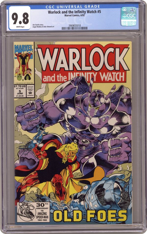 "Old Foes!" Story by Jim Starlin. Art by Angel Medina and Bob Almond. The being known as Omega seeks ultimate power and has captured Drax, Gamora, Moondragon, and Pip for this very purpose. Now, it falls on Adam Warlock to rescue his fellow Guardians of the Infinity Gems. But first, he must seek council from the secret member of the Infinity Watch, the bearer of the Reality Gem. Plus, what connection does Omega have to an enemy from Warlock's past? 32 pages. Cover price $1.75. Grade: CGC 9.8 explanation of grade Condition: Used (collectible)