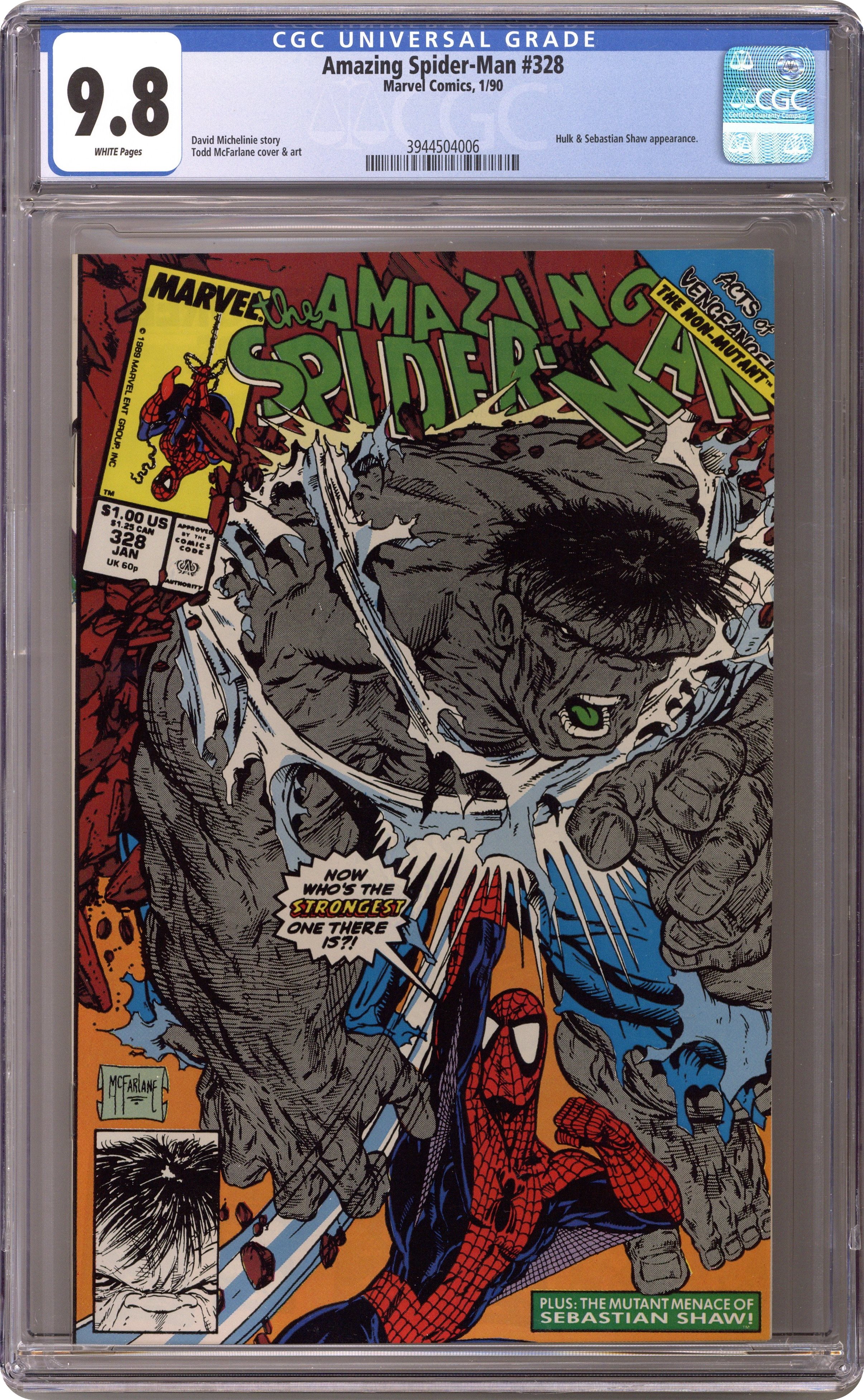 Ended Jul 14 2023 Winning Bid $111 Direct Edition. "Shaw's Gambit" Acts of Vengeance crossover. Guest-starring the Hulk. Script by David Michelinie. Art by Todd McFarlane. Cover by Todd McFarlane. Plot continues from Web of Spider-Man 60. The powerful cabal masterminding the Acts of Vengeance is still trying to kill the web-slinger despite his new cosmic powers! And the next super-villain gunning for Spidey is Sebastian Shaw! However the Hellfire Club's Black King likes to fight by proxy! And who better to use than the Hulk! Shaw picks up the former Green Goliath in the Nevada desert and drops him in the middle of Manhattan! And the battle is joined! The cosmic-powered wall-crawler and the gamma-radiated Hulk throw down from Times Square to the Roosevelt Island ruins! An out-of-this-world ending! Plot continues in Spectacular Spider-Man 160. Cameo appearances by Mary Jane Watson and Flash Thompson. (Notes: This issue completes Todd McFarlane's dynamic 2-year run as the penciler of the Amazing Spider-Man series -- highlighted by the co-creation of Venom (aka Eddie Brock) and the initial Venom story arcs in issues 298-300 and 315-317. This story was reprinted in 1993 in the trade paperback: Spider-Man -- The Cosmic Adventures.) 32 pages. Cover price $1.00. Grade: CGC 9.8 explanation of grade Condition: Used (collectible)