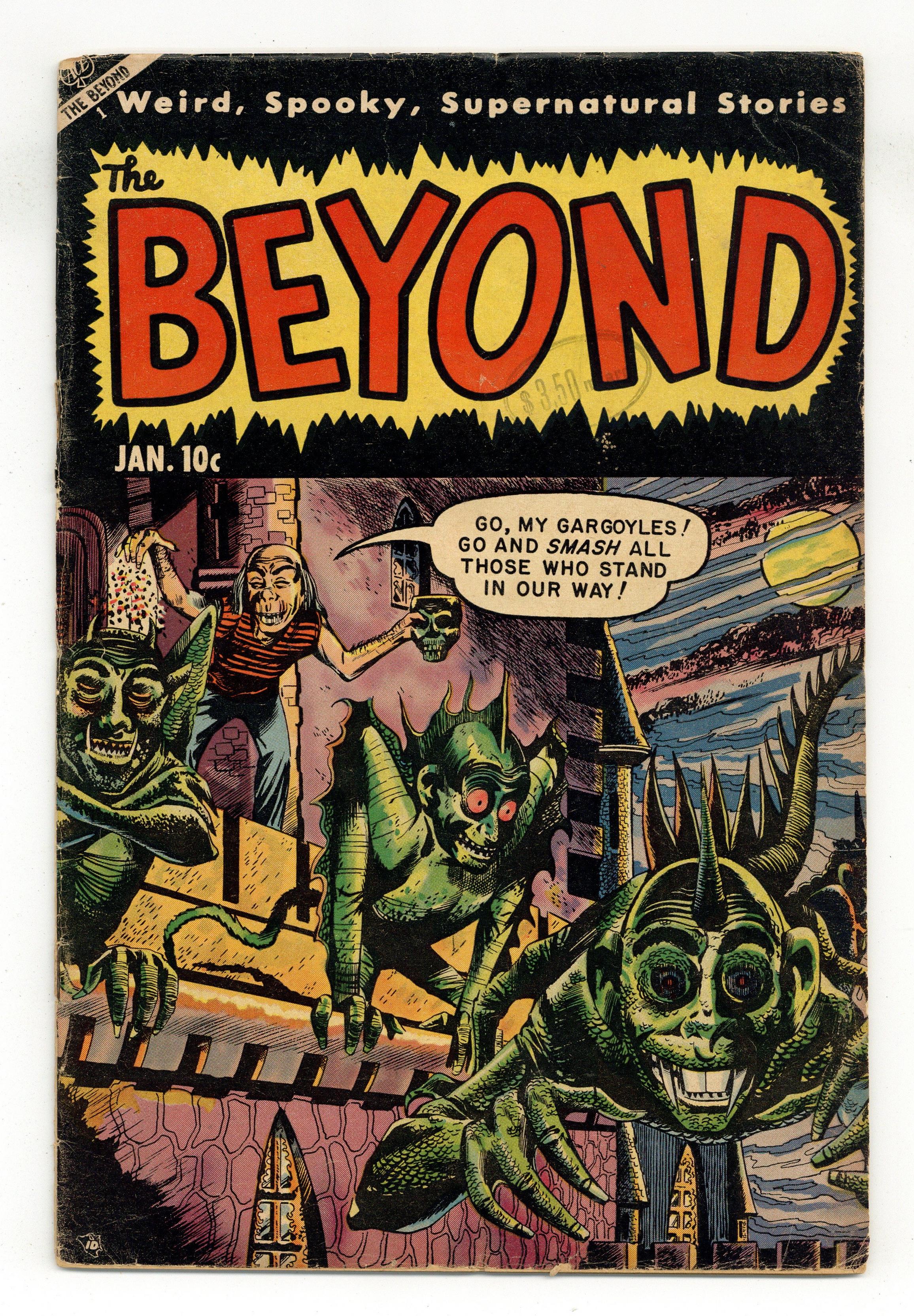 Step into My Empty Shroud, art by Lou Cameron; The gangster Reynolds is executed in the electric chair and buried in Potter's Field; In his mind he refuses to have died and battles his way out of a cemetery full of collegial skeletons. These, My Hands of Doom, art by Ken Rice; Cosmos, "an ugly, twisted man", is a masterful sculptor, but unrecognized; He swears revenge, makes a deal with the devil and gets a rare gift: anything he touches turns to stone. Lair of the Black Widow, art by Sy Grudko. The Talking Skull, art by Jim McLaughlin. 36 pgs. $0.10. Cover price $0.10. Grade: GD+ 2.5 explanation of grade Condition: Used (collectible)