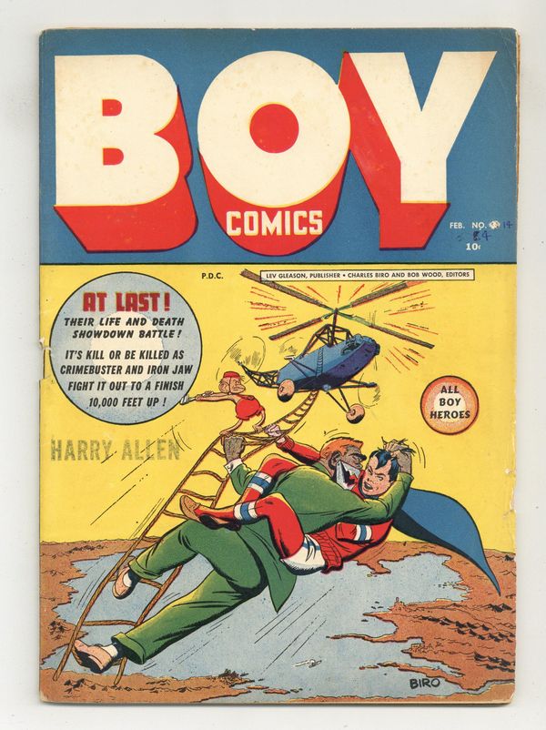 Cover by Charles Biro. Stories and art by Alan Mandel, Dick Wood, Dick Briefer, Rudy Palais and Charles Biro. An anthology title from publisher Lev Gleason and his primary creator, Charles Biro, featuring teen hero Crimebuster and his nemesis Iron Jaw. Crimebuster seeks the kidnapped son of an important US military figure and finds his old foe Iron Jaw at the heart of it. Yankee Longago encounters Ponce De Leon and the Fountain of Youth, featuring art by Dick Briefer. Swoop Storm uses his new snow plane to take on Japanese forces invading the US territory of Alaska. Crimebuster; Young Robin Hood; Boy Comics Hero of the Month; Daredevil: The Killer Who Couldn't Retire; Swoop Storm; Little Dynamite; Yankee Longago. 60 pages, Full Color. Cover price $0.10. Grade: VG 4.0 explanation of grade Condition: Used (collectible)