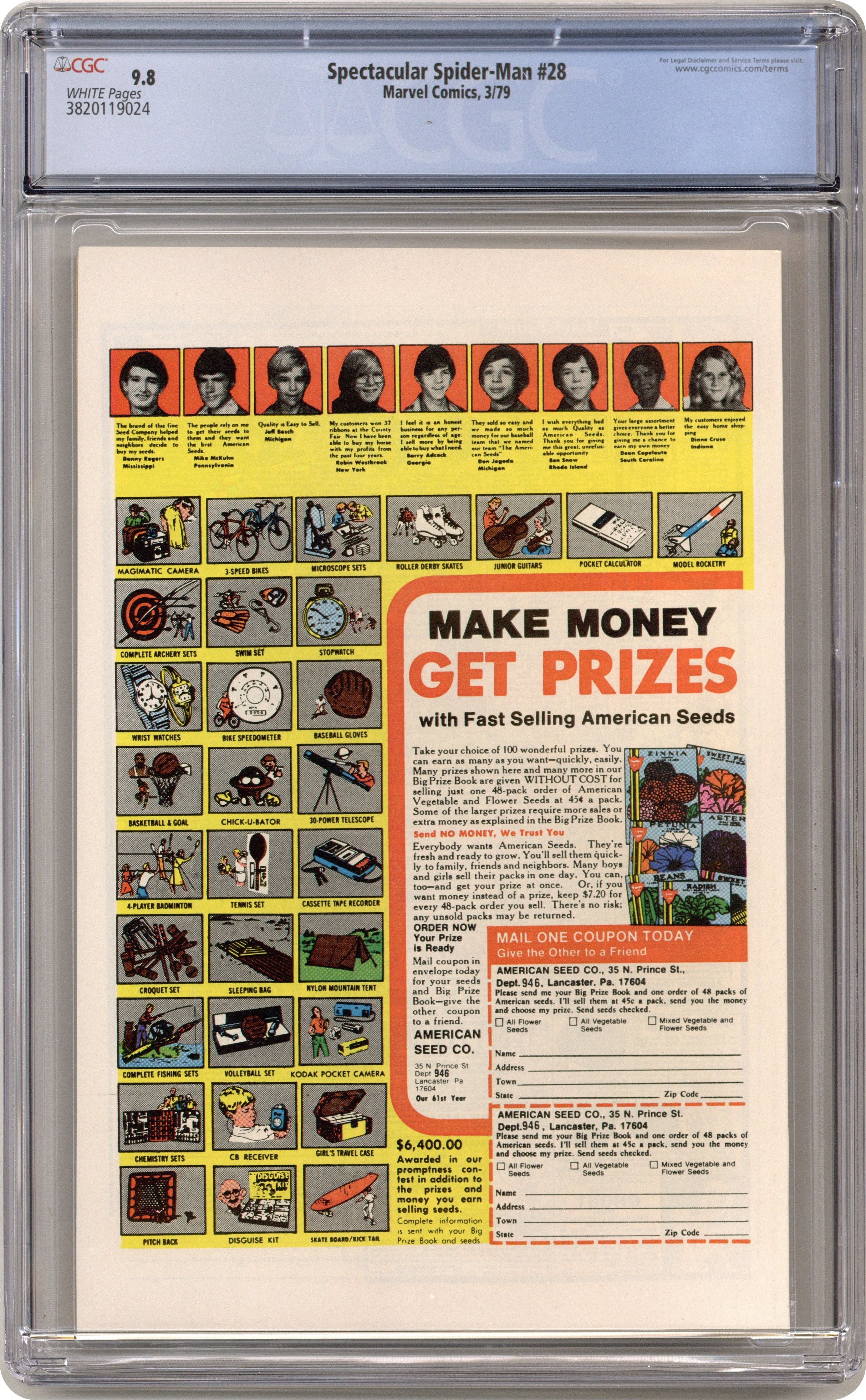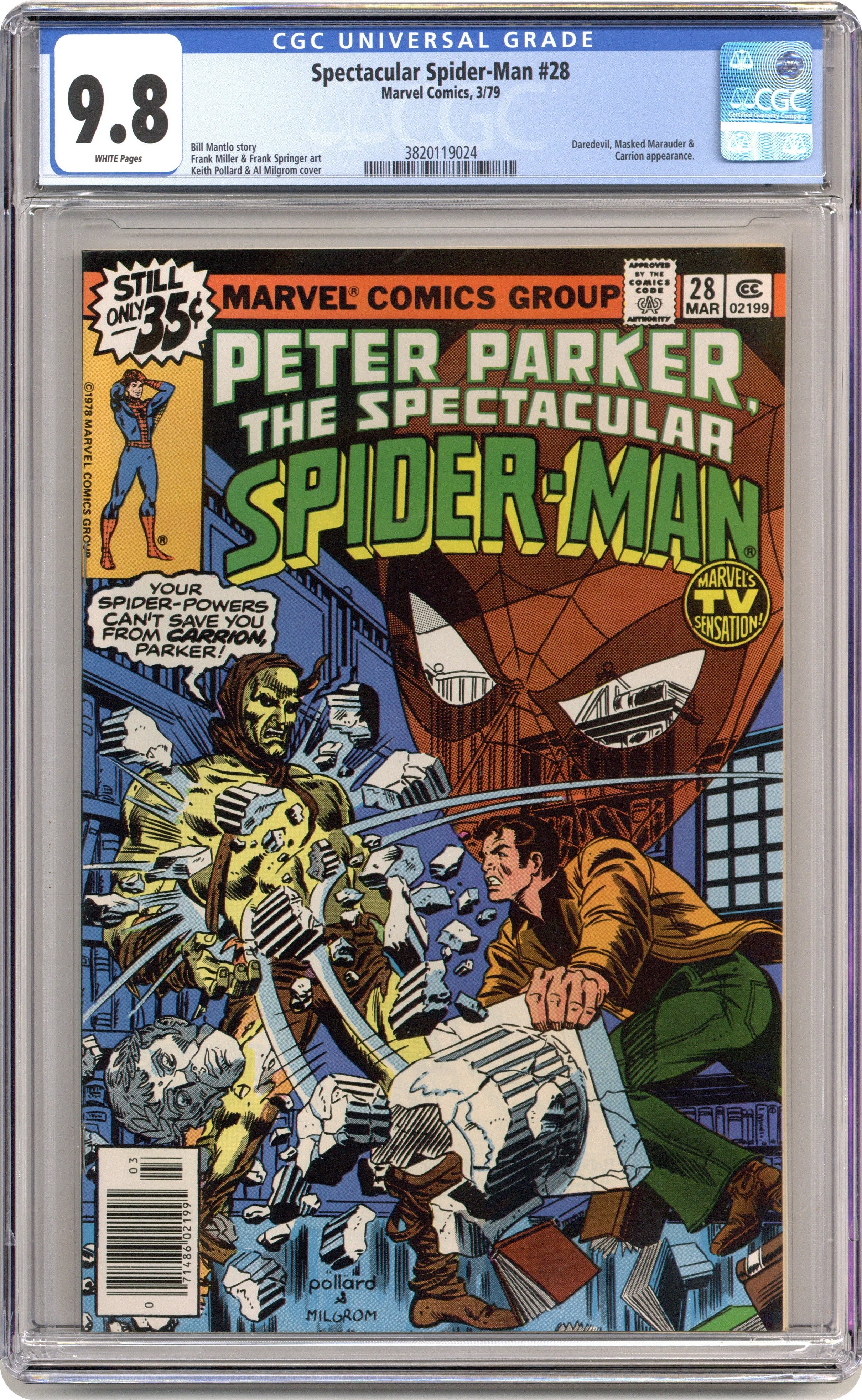 "Ashes to Ashes!" Guest-starring Daredevil. Script by Bill Mantlo. Pencils by Frank Miller. Inks by Frank Springer. Cover by Keith Pollard and Al Milgrom. The situation is desperate indeed as the Masked Marauder's nuclear bombdroid is headed for the heart of New York City! Only one hero can stop the bomb...the Spectacular Spider-Man! But how is a blind wall-crawler going to do that? While Spidey tries to disarm the bombdroid, Daredevil battles the Masked Marauder one-on-one! Meanwhile, Carrion has trashed Peter Parker's apartment and is lying in wait for Peter at the Empire State University campus library! Cameo appearances by Mary Jane Watson and Hector Ayala. (Note: This issue was reprinted in 1984 in Spider-Man and Daredevil 1, and again in 1994 in The Complete Frank Miller Spider-Man,) 32 pages Cover price $0.35. Grade: CGC 9.8 explanation of grade Condition: Used (collectible)