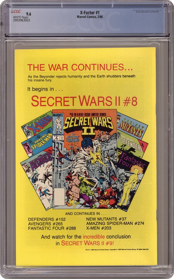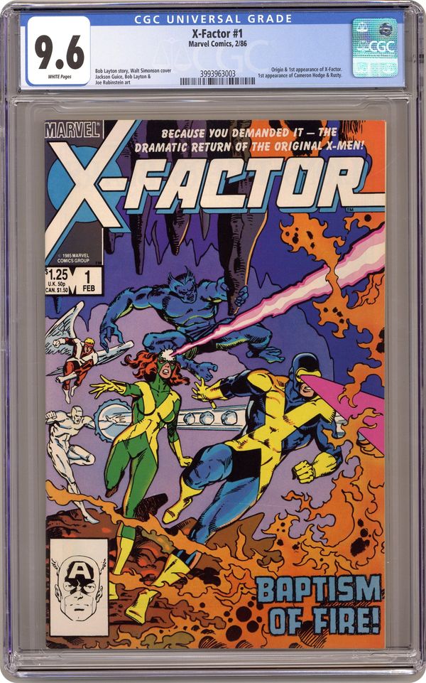Direct Edition. Return of Jean Grey: Part 3 of 3 - "Third Genesis!" Mr. Fantastic cameo. Avengers flashback cameo. Story by Bob Layton. Art by Jackson Guice, Bob Layton, and Joe Rubinstein. Cover by Walt Simonson. Story continued from Avengers (1963-1996 1st Series) #263 and Fantastic Four (1961-1996 1st Series) #286. Charles Xavier is gone, whisked away to the far side of the universe by the Shi'Ar Empire (see Uncanny X-Men #200), but his dream is not dead. His original X-Men, Cyclops, Angel, Beast, Ice Man, and the recently resurrected Jean Grey, have reunited as the super-group called X-Factor to see his dream of mutants and humans co-existing in peace realized and brought to fruition. Cover price $1.25. Grade: CGC 9.6 explanation of grade Condition: Used (collectible)