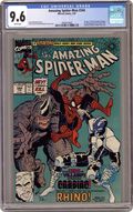 Direct Edition. First appearance of Cletus Kasady aka Carnage in "Hearts and Powers." Script by David Michelinie. Pencils by Erik Larsen. Inks by Randy Emberlin. Cover by Erik Larsen and Randy Emberlin. In a warehouse on the waterfront, the Spectacular Spider-Man runs into a new costumed crusader...Cardiac! Is he a hero or villain or vigilante or all of the above? After a brief confrontation, the web-slinger isn't quite sure! But later on, at a chemical plant in the Bronx, Cardiac and the wall-crawler are forced to team up to tackle the rampaging Rhino! So, Spidey will consider Cardiac a friend...for now! Meanwhile, in Ryker's Island, Eddie Brock gets to know his new cellmate: Cletus Kasady...the future Carnage! Cameo appearances by Justin Hammer and Mary Jane Watson. 36 pages. $1.00 cover price. Cover price $1.00. Grade: CGC 9.6 explanation of grade Condition: Used (collectible)
