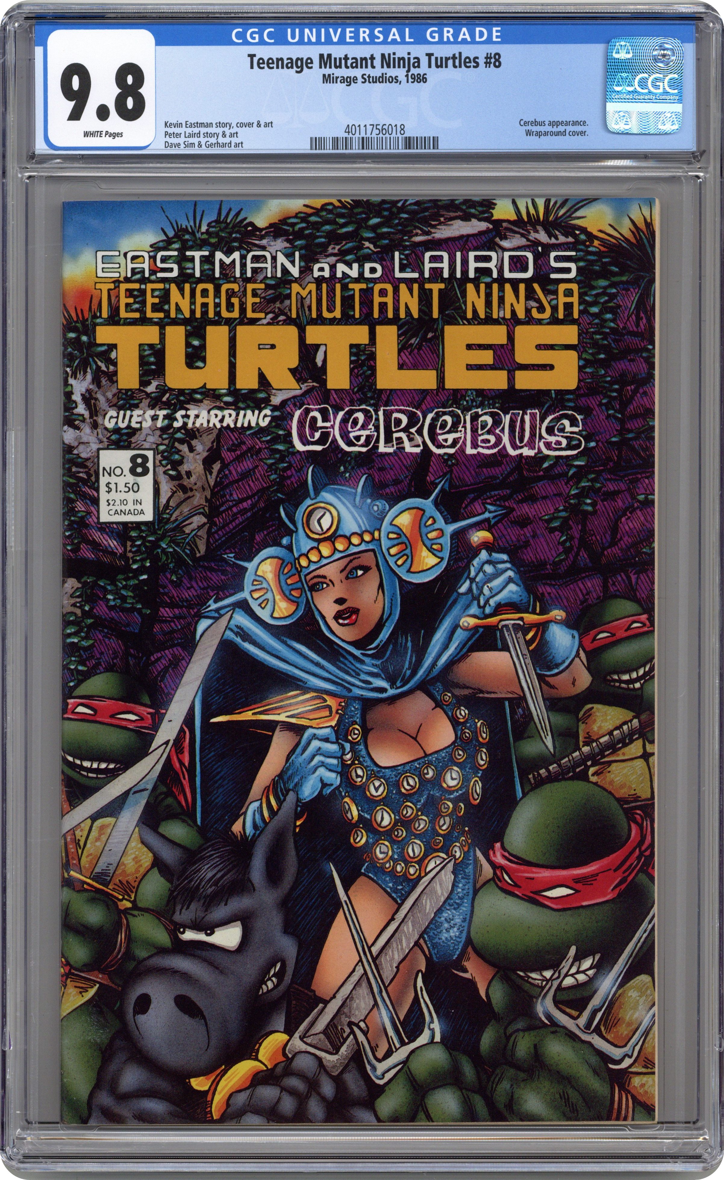 The original series that introduced the Turtles to the world. An errant time traveler accidentally sends the Turtles and herself through time, where they meet Dave Sims Cerebus the Aardvark. Story, art and cover by Dave Sim, Kevin Eastman & Peter Laird; backgrounds by Gerhard. Black and white; 32 pages. Cover price $1.50. Grade: CGC 9.8 explanation of grade Condition: Used (collectible)