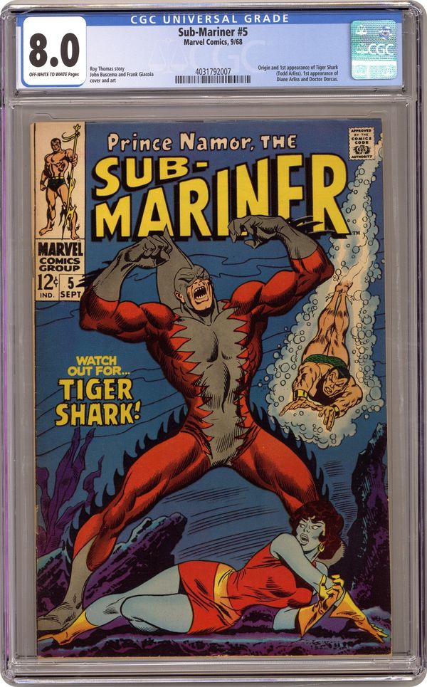 Ended Oct 22 2023 Winning Bid $120 1st appearance of Tiger Shark. "Watch Out for Tiger Shark!" Written by Roy Thomas. Art by John Buscema and Frank Giacoia. Get ready for the most dangerous creature that ever swam the ocean depths - Tiger Shark. Can even the mighty Sub-Mariner survive this deadly new foe? 32 pages, FC. Cover price $0.12. Grade: CGC 8.0 explanation of grade Condition: Used (collectible)