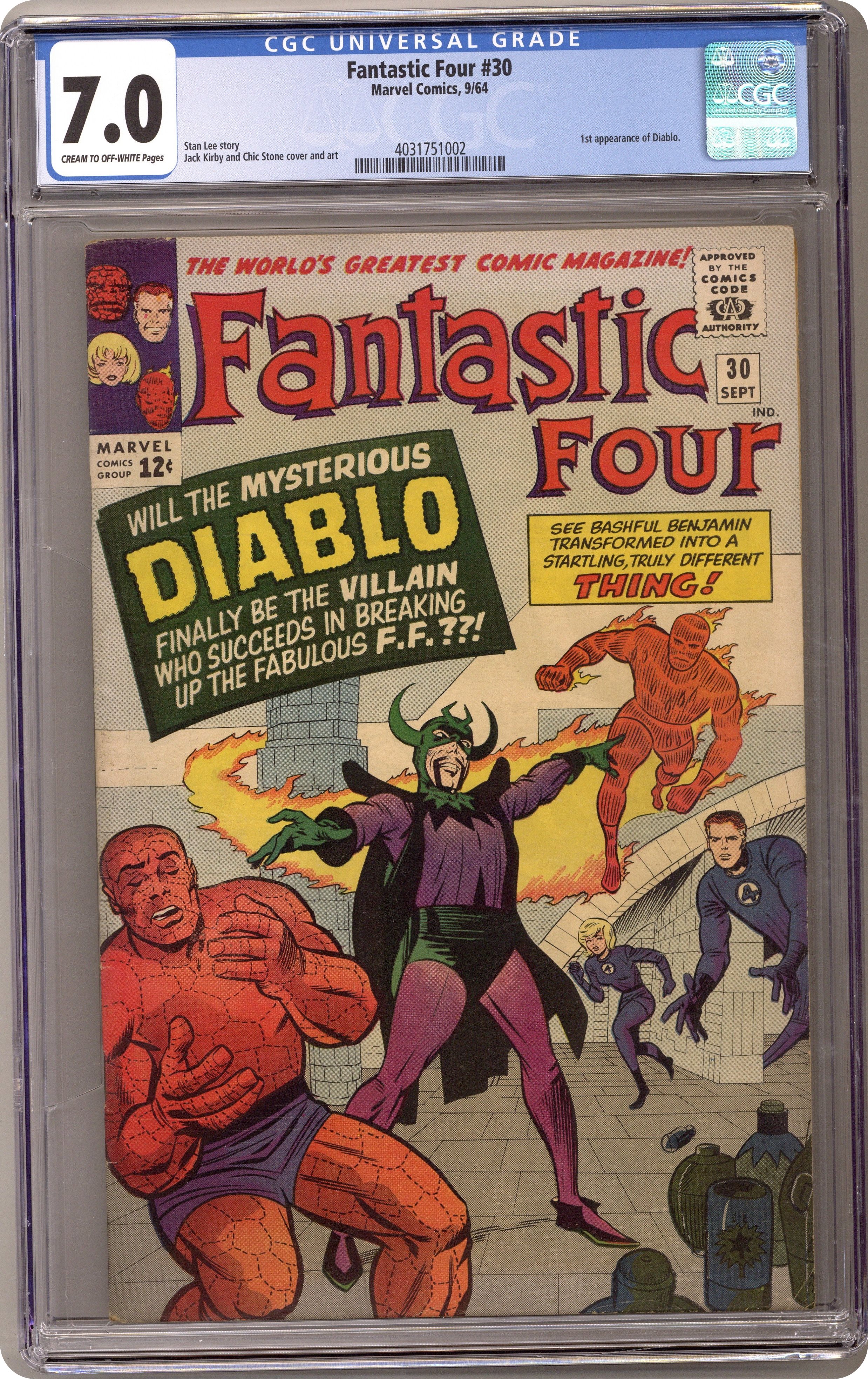 Ended Oct 17 2023 Winning Bid $115 "The Dreaded Diablo!" Written by Stan Lee. Pencils by Jack Kirby. Inks by Chic Stone. Cover pencils by Jack Kirby with inks by Chic Stone. On a vacation in Transylvania, the FF encounter a castle inhabited by Diablo. Note: First Appearance of Diablo. 36 pgs. Cover price $0.12. Grade: CGC 7.0 explanation of grade Condition: Used (collectible)