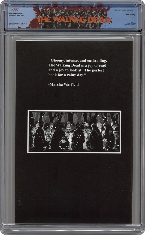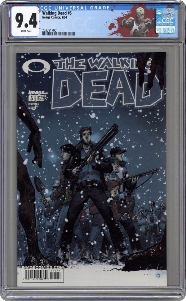 Written by ROBERT KIRKMAN Art & cover by TONY MOORE B&W 32 pgs. $2.95 Monthly ongoing series On sale 25 FEBRUARY, 2004 MATURE READERS WARNING THE CONCEPT: An epidemic of apocalyptic proportions has swept the globe, causing the dead to rise and feed on the living. In a matter of months society has crumbled: no government, no grocery stores, no mail delivery, no cable TV. In a world ruled by the dead, we are forced to finally begin living. THIS ISSUE: It was only a matter of time before their camp was attacked...and that time has come. Rick Grimes and company find themselves surrounded by zombies. Who will die, who ? if anyone ? will survive? Who will be the next to join the walking dead? Cover price $2.95. Grade: CGC 9.4 explanation of grade Condition: Used (collectible)