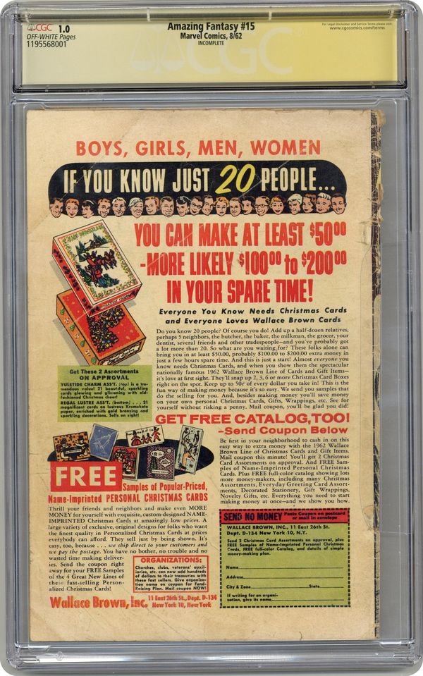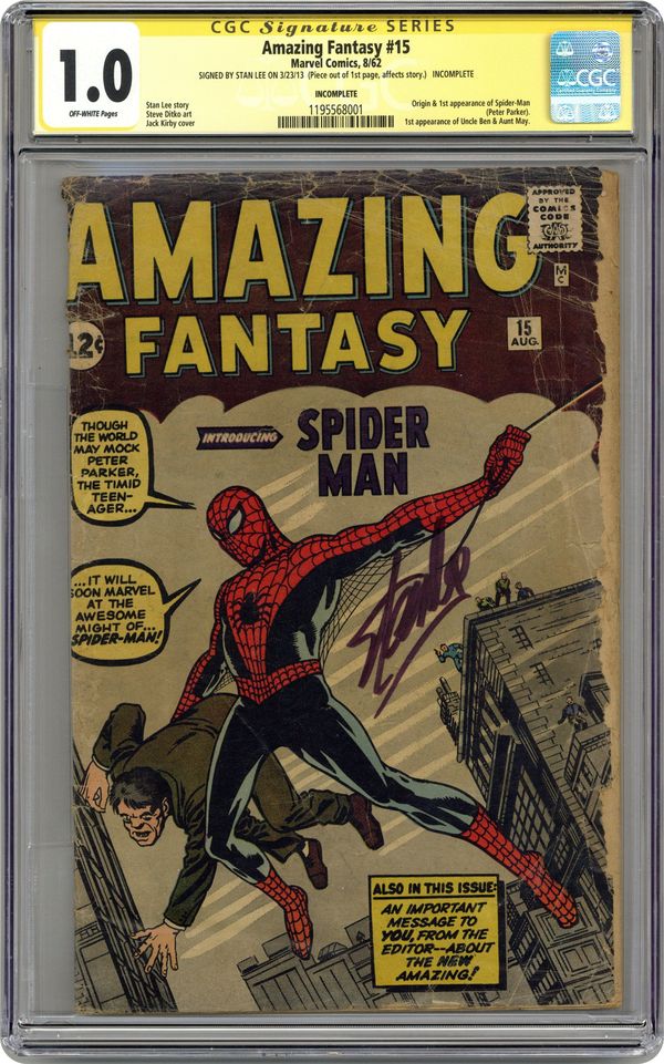 Origin and 1st Appearance of Spider-Man by Stan Lee and Steve Ditko (11pgs). 1st appearance of Aunt May and Uncle Ben. Cover pencils by Jack Kirby, inks by Steve Ditko. "Spider-Man!", script by Stan Lee, art by Steve Ditko; Peter Parker is bitten by a radioactive spider and gains the abilities of a spider; When he fails to stop a burglar who runs past him, his uncle is killed as a result; He therefore swears never to shirk his responsibility again. "The Bell-Ringer!", script by Stan Lee, art by Steve Ditko; On a small Mediterranean island of fisherfolk, Old Pedros is the town bell-ringer; One day the volcano atop the island begins to erupt; The villagers evacuate and put out to sea; Old Pedros, though, stays at the church; "The bells must be rung," he tells himself. "Man in the Mummy Case!", script by Stan Lee, art by Steve Ditko; A fugitive accepts a mummy's help to escape the police, only to find himself an ancient Egyptian slave. Stan Lee's editorial explaining title change. "There Are Martians Among Us!", script by Stan Lee, art by Steve Ditko; The discovery of a crashed flying saucer frightens a small town, especially when the townspeople realize that the Martians are among them; A month goes by with the aliens still at large. 36 pgs., full color. Cover price $0.12. Grade: CGC 1.0 explanation of grade Condition: Used (collectible)