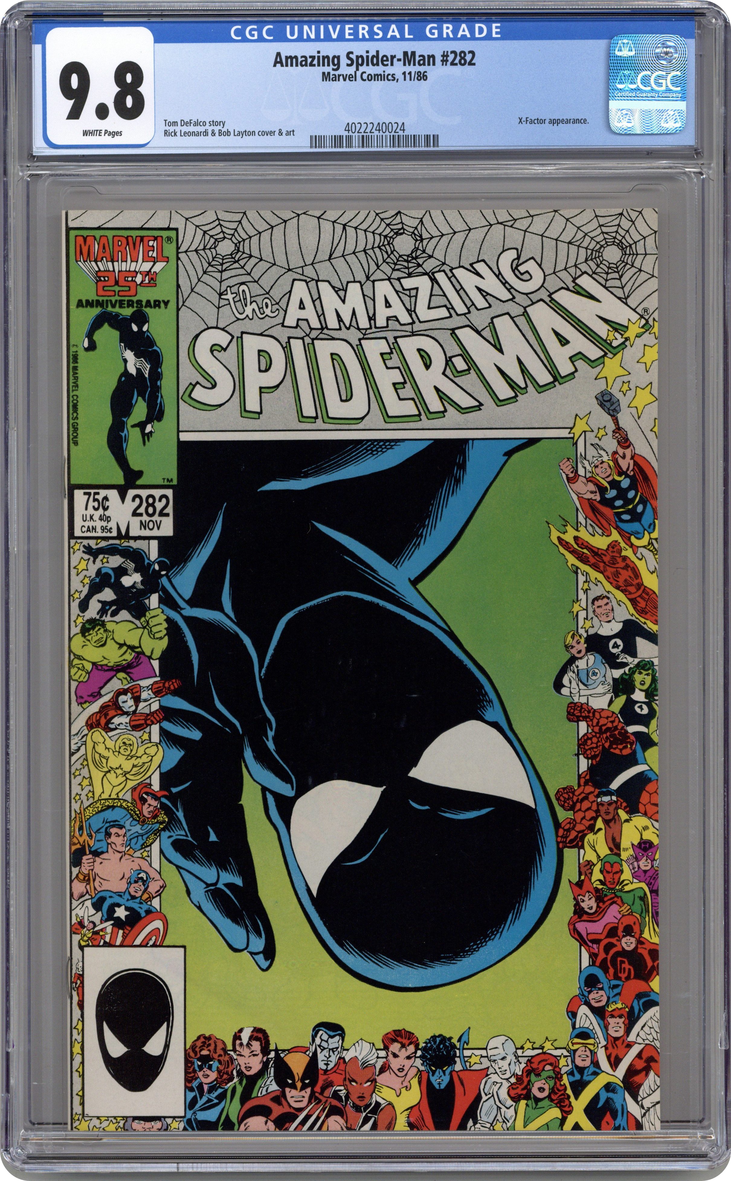 Marvel 25th Anniversary Cover -- "The Fury of X-Factor!" Guest-starring X-Factor. Script by Tom DeFalco. Pencils by Rick Leonardi. Inks by Bob Layton. Cover by Rick Leonardi and Bob Layton. J. Jonah Jameson hires X-Factor to capture Spider-Man! However the undercover group of former X-Men aren't so sure that's a good idea. The web-slinger is not a mutant; and he's very tough to catch! But at this moment the amazing one is basically out on his feet after getting hammered by the Rhino last issue! And despite Mary Jane's best efforts to convince him to rest, the wondrous wall-crawler ventures outside his apartment...and stumbles right into X-Factor's ambush! Are the former X-Men going to collect their bounty at the web-slinger's expense? Cameo appearances by Betty Leeds, Joe Robertson, and Cameron Hodge. X-Factor Lineup: Cyclops, Jean Grey, Angel, Beast, and Iceman. (Note: This issue was reprinted in Marvel Tales 290.) 36 pages. Cover price $0.75. Grade: CGC 9.8 explanation of grade Condition: Used (collectible)