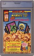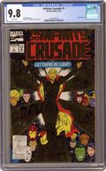 Gold foil enhanced cover. Cover pencils by Ron Lim, inks by Al Milgrom. "Epiphany," script by Jim Starlin, pencils by Ron Lim, inks by Al Milgrom; Adam Warlock senses a cosmic disturbance and contacts Eternity to talk about it; Eternity rebuffs him and he is then confronted by his good half, the Goddess, who zaps him away; The most spiritual minded of the heroes of earth are contacted by the Goddess and asked to join in her crusade for universal enlightnement; They join her quest and are teleported away, leaving confused teammates behind; As the remaining heroes gather to try and figure out where their missing companions have gone, the Goddess forms a planet and Paradise Omega for her followers. Cont in Warlock Chronicles #1. 52 pgs., full color. $3.50. Cover price $3.50. Grade: CGC 9.8 explanation of grade Condition: Used (collectible)