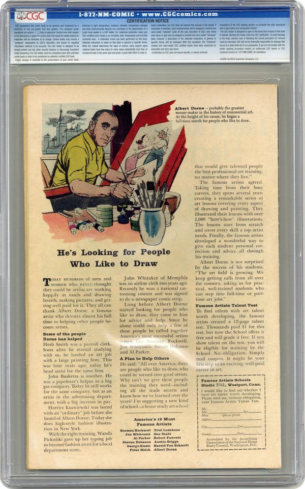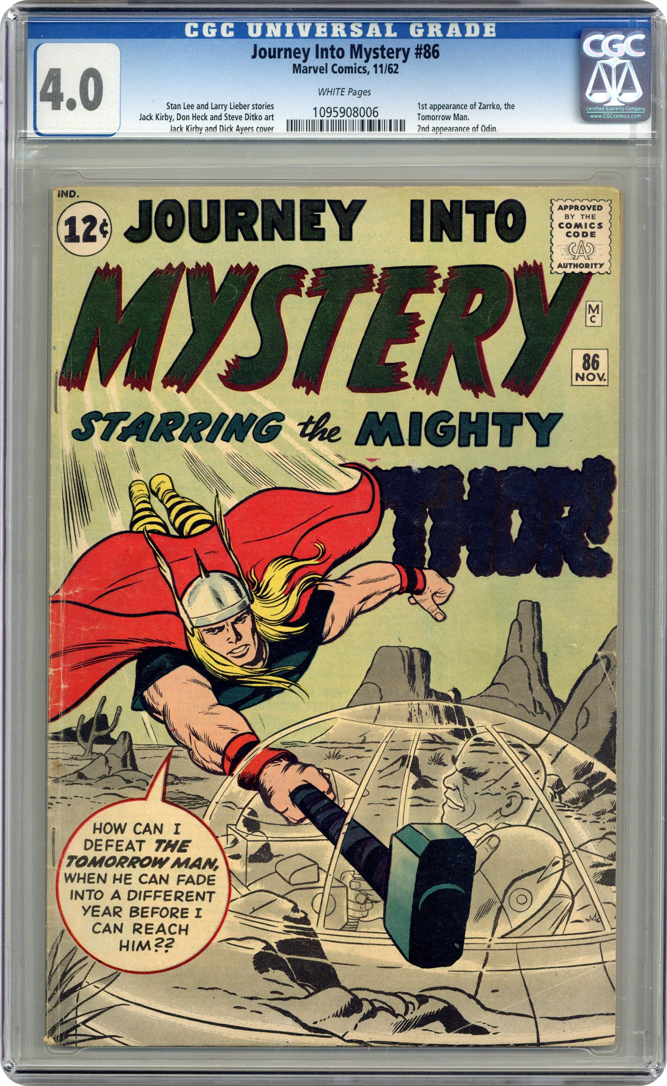 Cover pencils by Jack Kirby, inks by Dick Ayers. First full appearance of Odin and the Tomorrow Man in "On the Trail of the Tomorrow Man!", script by Stan Lee (plot) and Larry Lieber (script), pencils by Jack Kirby, inks by Dick Ayers; Zarrko of the year 2262 goes back in time and steals a cobalt bomb in 1962, but Thor chases him forward in time and defeats him; Jane Foster (Nelson) cameo. "Weather Man" two-page text story, art by Joe Maneely. "Humans, Keep Out!", script by Stan Lee, art by Don Heck; Humans are distressed to discover that the Venusians believe them to be hostile and have built robots to destroy any expedition that lands. "The Changeling!", script by Stan Lee, art by Steve Ditko; An ugly king threatens a sorcerer with death unless he makes the king "the most handsome male" so the sorcerer turns him into a swan. 36 pages, full color. Cover price $0.12. Grade: CGC 4.0 explanation of grade Condition: Used (collectible)