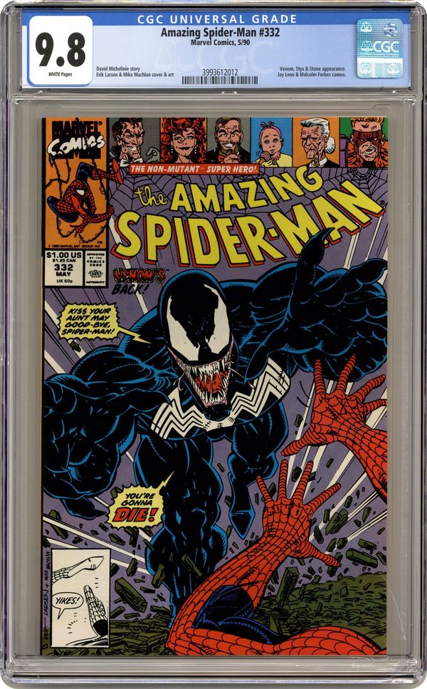 Ended Feb 19 2024 Winning Bid $82 Direct Edition. "Sunday in the Park with Venom" Part 1 of 2. Script by David Michelinie. Pencils by Erik Larsen. Inks by Mike Machlan, Jack Abel, Keith Wilson, Keith Williams, Brad Vancata, Joe Rosas, and Mickey Ritter. Cover by Erik Larsen and Mike Machlan. The web-slinger's worst nightmare is back again! Venom! And so is Mary Jane's! Jonathan Caesar! Add Styx and Stone to the volatile mix and the Parkers are in for a very rough day! The Amazing Spider-Man battles the psychotic Venom in Central Park, while Mary Jane confronts the deranged Caesar at Bedford Towers! Could the wall-crawler and his wife score a double victory against their respective nemeses? Mary Jane has a chance; Spider-Man not so much. Cameo appearances by Aunt May, Jimmy Olsen, Jay Leno, and Malcolm Forbes. (Note: The letters page contains a statement of ownership: average print run 426,790; average paid circulation 266,100.) 36 pages. Cover price $1.00. Grade: CGC 9.8 explanation of grade Condition: Used (collectible)