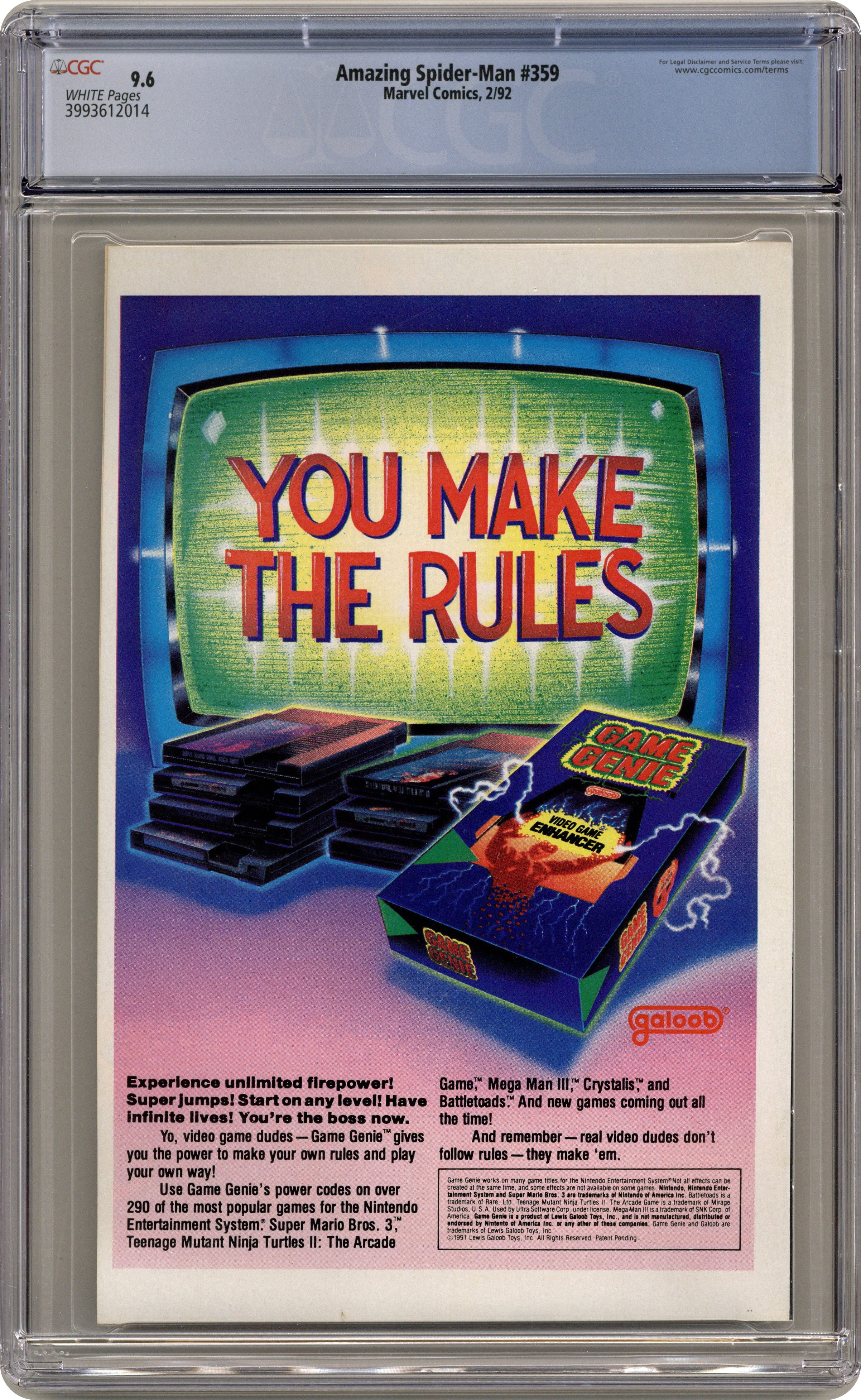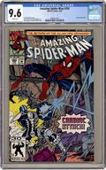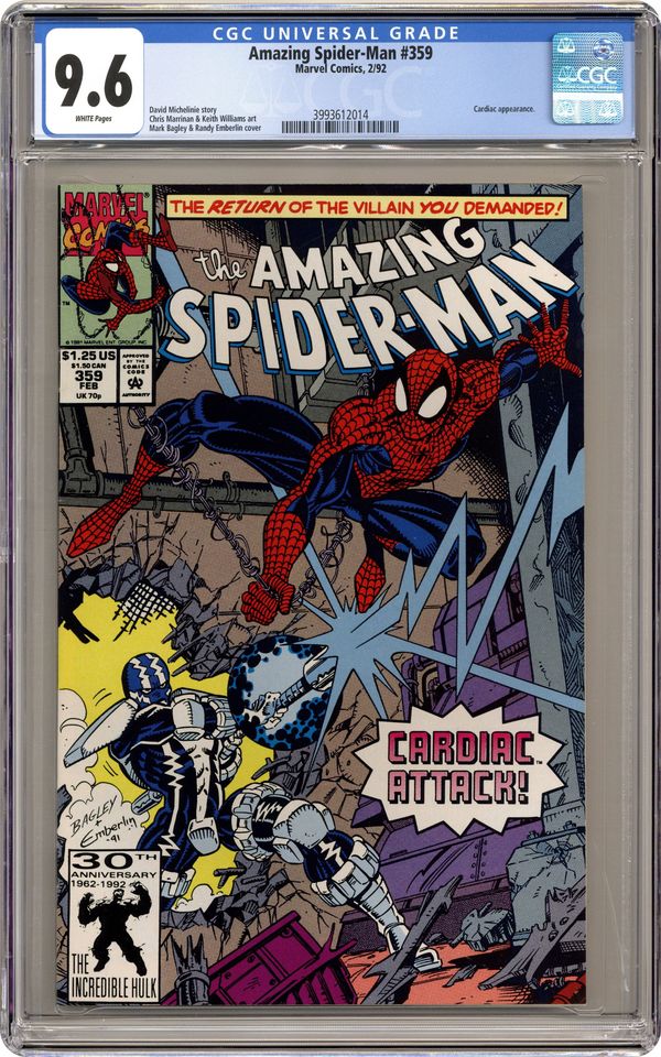 Direct Edition. First $1.25 cover price. "Toy Death!" Part 1 of 2. Script by David Michelinie. Pencils by Chris Marrinan. Inks by Keith Williams. Cover by Mark Bagley and Randy Emberlin. Cardiac is back! And bringing his own brand of justice to the Big Apple! Each day Dr. Elias Wirtham reads the latest corporate exposé in the Daily Bugle...and then goes after that company the following night! But Ben Urich and Peter Parker have caught on to Cardiac's pattern! So the next evening the web-slinger hides away in the manufacturing plant of a corrupt toymaker! Waiting for his very own...Cardiac attack! Cameo appearances by Cletus Kasady, Mary Jane Watson, Flash Thompson, J. Jonah Jameson, and the Black Cat. First $1.25 issue. (Note: The letters page previews the cover to Amazing Spider-Man 361.) 36 pages. Cover price $1.25. Grade: CGC 9.6 explanation of grade Condition: Used (collectible)