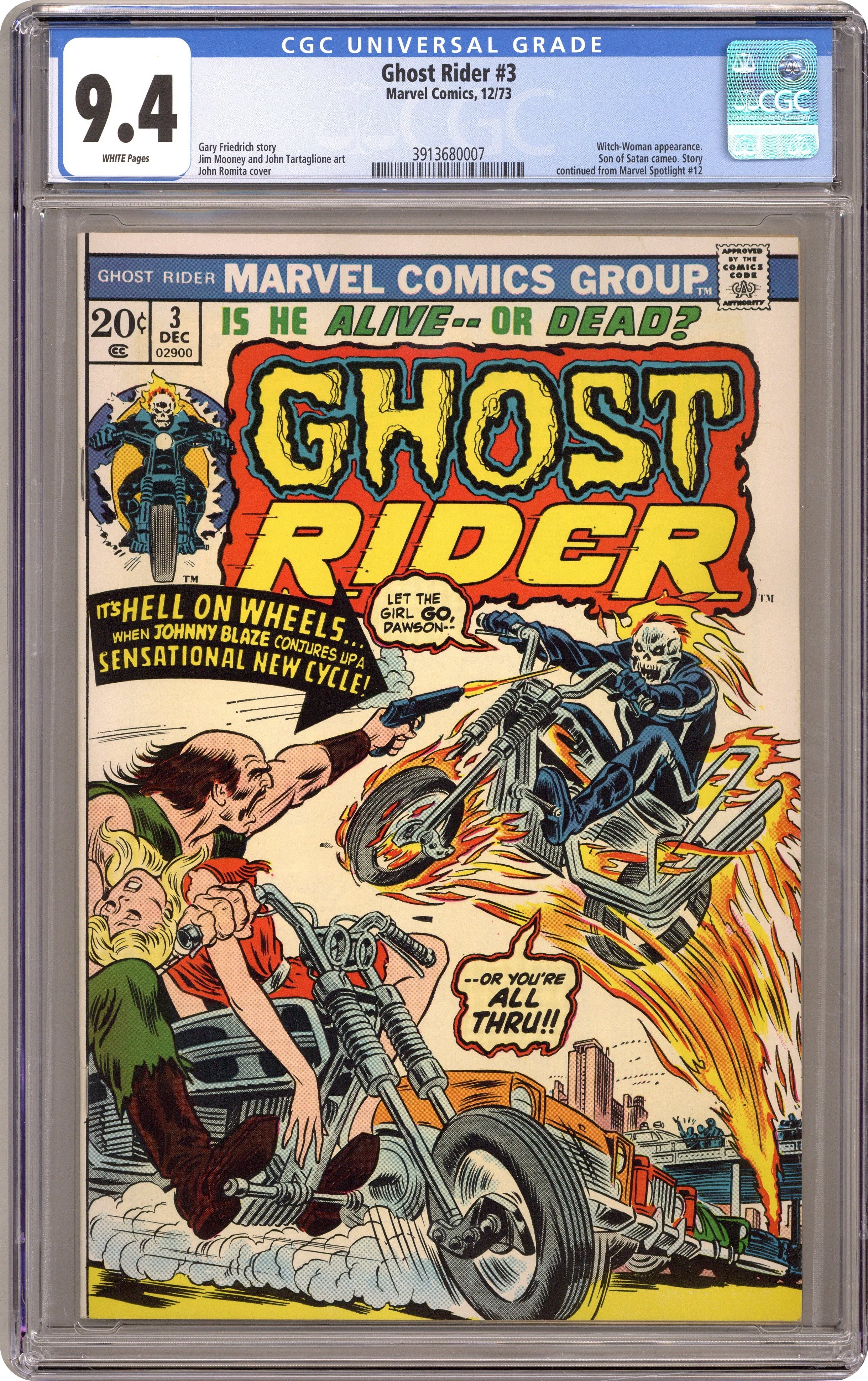 "Wheels on Fire!" Guest-starring Daimon Hellstrom (Son of Satan). Story by Gary Friedrich. Art by Jim Mooney and John Tartaglione. Cover by John Romita, Sr. It had to happen, the fateful final showdown with Big Daddy Dawson! Plus, in this issue, Ghost Rider learns how to summon forth his mystical motorcycle! 32 pages, FC. Cover price $0.20. Grade: CGC 9.4 explanation of grade Condition: Used (collectible)