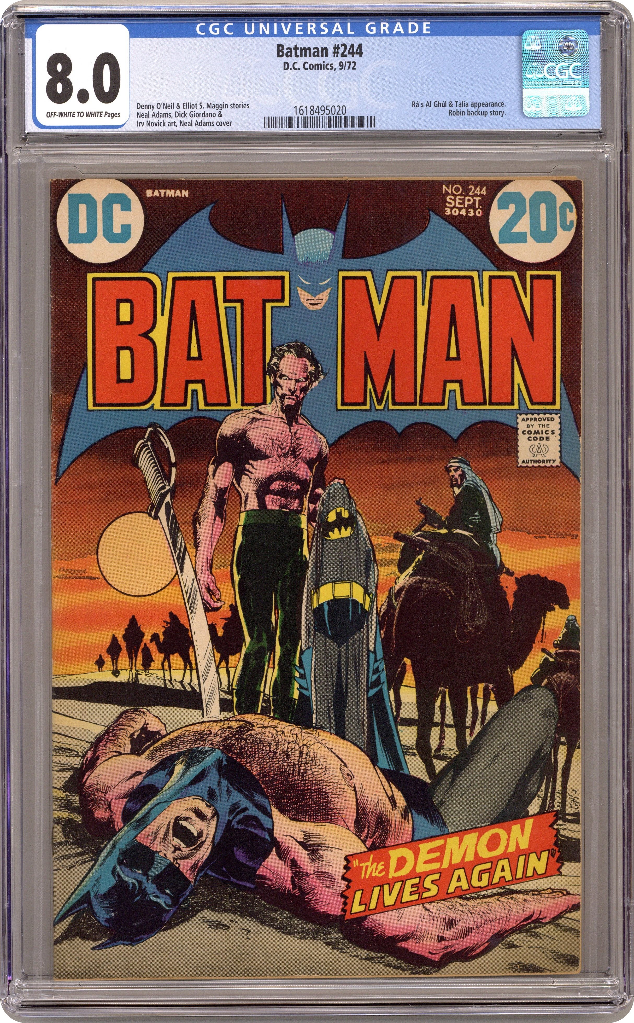 Ra's Al Ghul is back, and with a vengeance. Can Batman defeat the Demon in a one-on-one duel to the death? "The Demon Lives Again!" Talia appearance. Script by Denny O'Neil, pencils by Neal Adams, inks by Dick Giordano. Robin stars in the solo adventure "Teen-Age Trap!" Script by Elliot Maggin, pencils by Irv Novick, inks by Giordano. 36 Pages, Full Color. Cover price $0.20. Grade: CGC 8.0 explanation of grade Condition: Used (collectible)