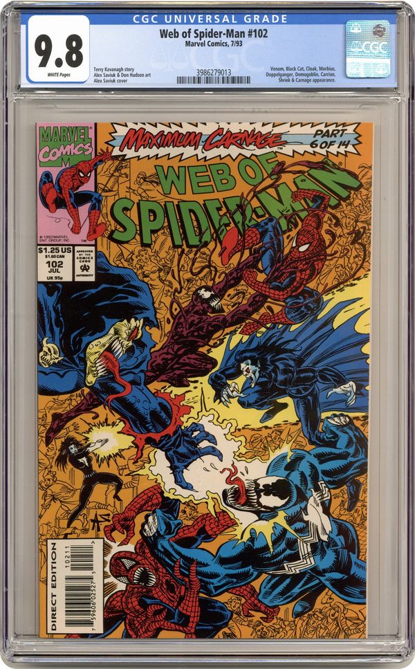 Direct Edition. "Sinking Fast" Maximum Carnage Part 6 of 14. Guest-starring Cloak and Dagger. Script by Terry Kavanagh. Pencils by Alex Saviuk. Inks by Don Hudson. Cover by Alex Saviuk. Story continues from Spectacular Spider-Man 201. Blood flows in the streets of Manhattan as Carnage's reign of terror continues unchecked! The good guys simply don't have enough firepower to stop Carnage, Shriek, the doppelganger, and the Demogobiln. The web-slinger, Black Cat, Cloak, and Venom desperately need another ally for their side! How about Morbius? He's available! Wow, the situation is truly bleak when a bloodthirsty vampire is the best choice! Meanwhile, Mary Jane is tired of her husband constantly running off to play Spider-Man, so she decides to check out a new trendy nightclub in Midtown! At the same time, Carnage and his crew, feeling refreshed, decide to check out a new trendy nightclub…in Midtown! Oh no! Oh yes, the next savage slugfest is going to get very personal for your friendly neighborhood Spider-Man! Story continues in Amazing Spider-Man 379. Cameo appearance by Carrion. 32 pages Cover price $1.25. Grade: CGC 9.8 explanation of grade Condition: Used (collectible)
