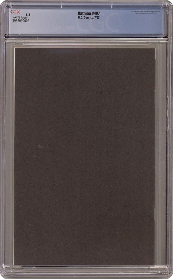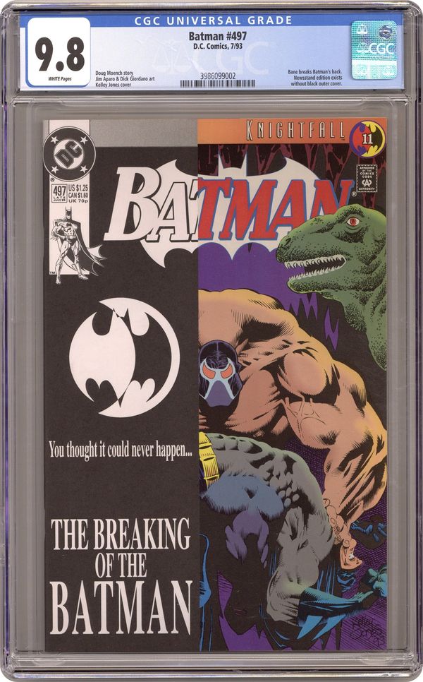 Direct Edition with Overlay cover. Bane breaks Batman's back in Batman KnightFall Part 11. Home turf does not prove an advantage when Bane breaks Batman's back in the Batcave in "The Broken Bat." KnightFall continues in Detective Comics (1937- ) #664. Written by Doug Moench. Pencils by Jim Aparo. Inks by Dick Giordano. Cover by Kelley Jones. 36 Pages, Full Color. Cover price $1.25. Grade: CGC 9.8 explanation of grade Condition: Used (collectible)