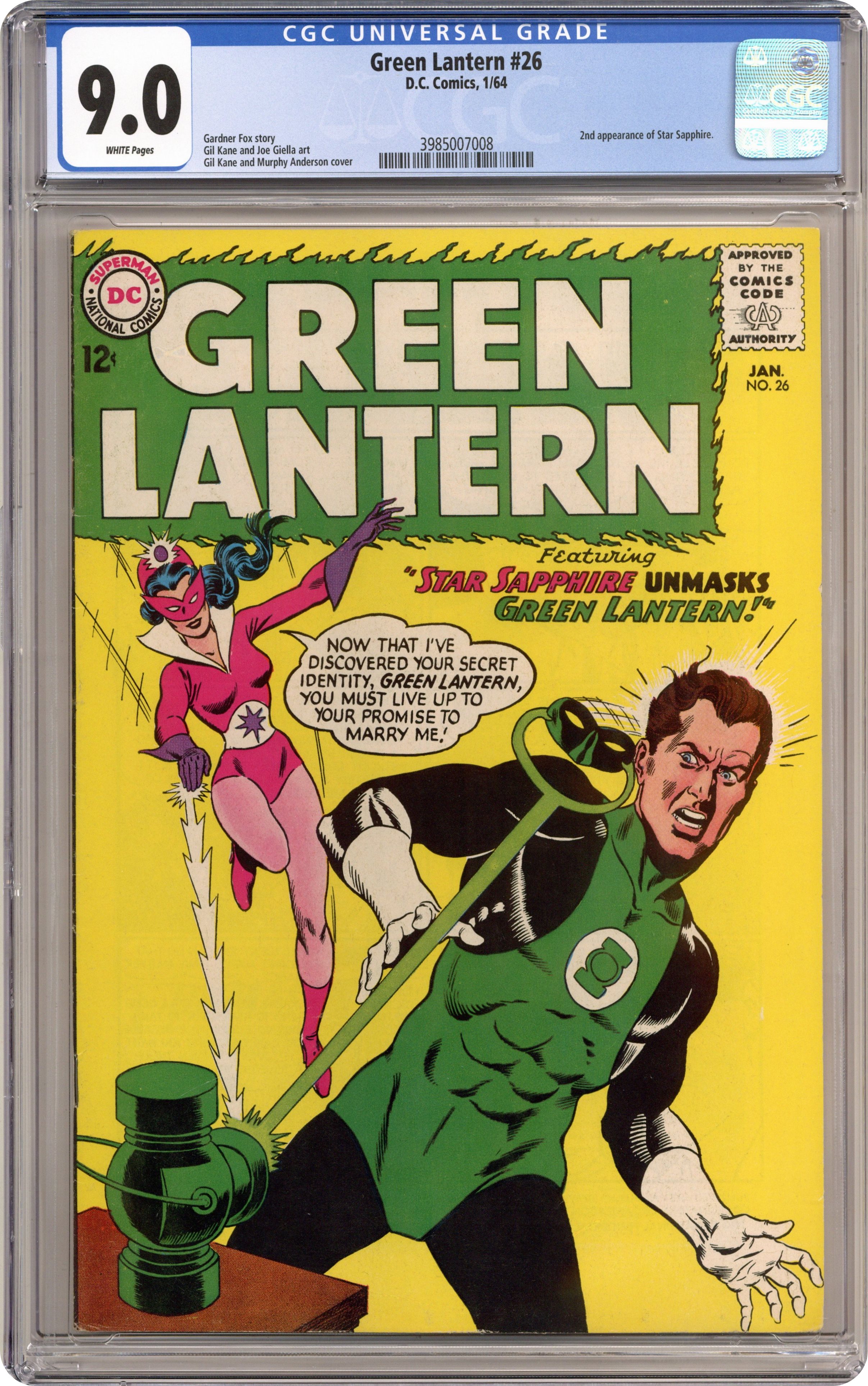 Cover pencils by Gil Kane, inks by Joe Giella. You Get What You Vote For! public service announcement starring Buzzy, script by Jack Schiff, art by Win Mortimer. Star Sapphire Unmasks Green Lantern!, script by Gardner Fox, pencils by Gil Kane, inks by Joe Giella; Carol Ferris becomes Star Sapphire again and engages Hal Jordan in a contest to prove who is superior. Hal Jordan loses and is unmasked by Star Sapphire, but accidently causes her to change back to Carol Ferris and forget the entire adventure. World Within the Power Ring!, script by Gardner Fox, pencils by Gil Kane, inks by Joe Giella; Imprisoned inside the Green Lantern ring by Abin Sur, Myrwhydden has regained his magical powers after Abin Sur's death and Hal Jordan enters the ring to defeat him and leave him re-imprisoned within the ring. Meteorites! fact half-page by Julius Schwartz. 36 pgs. $0.12. Cover price $0.12. Grade: CGC 9.0 explanation of grade Condition: Used (collectible)