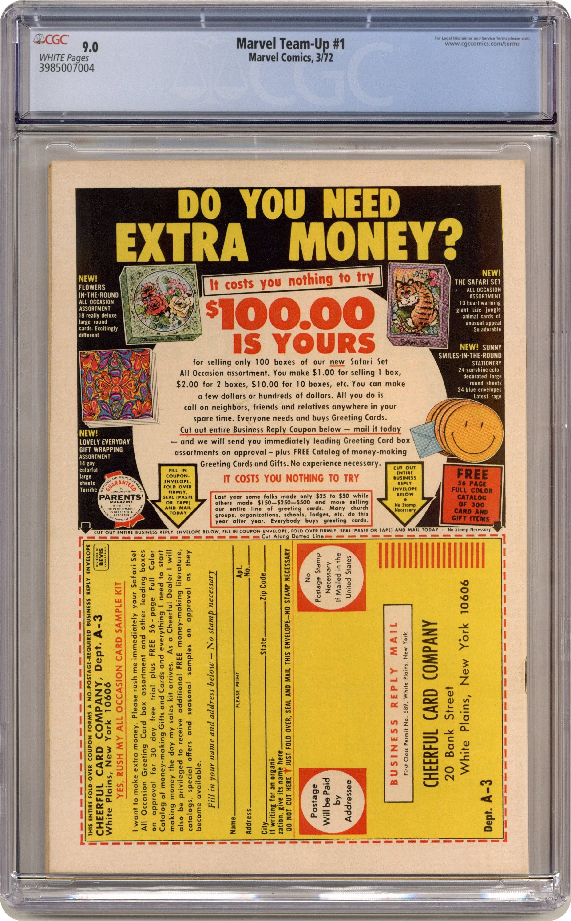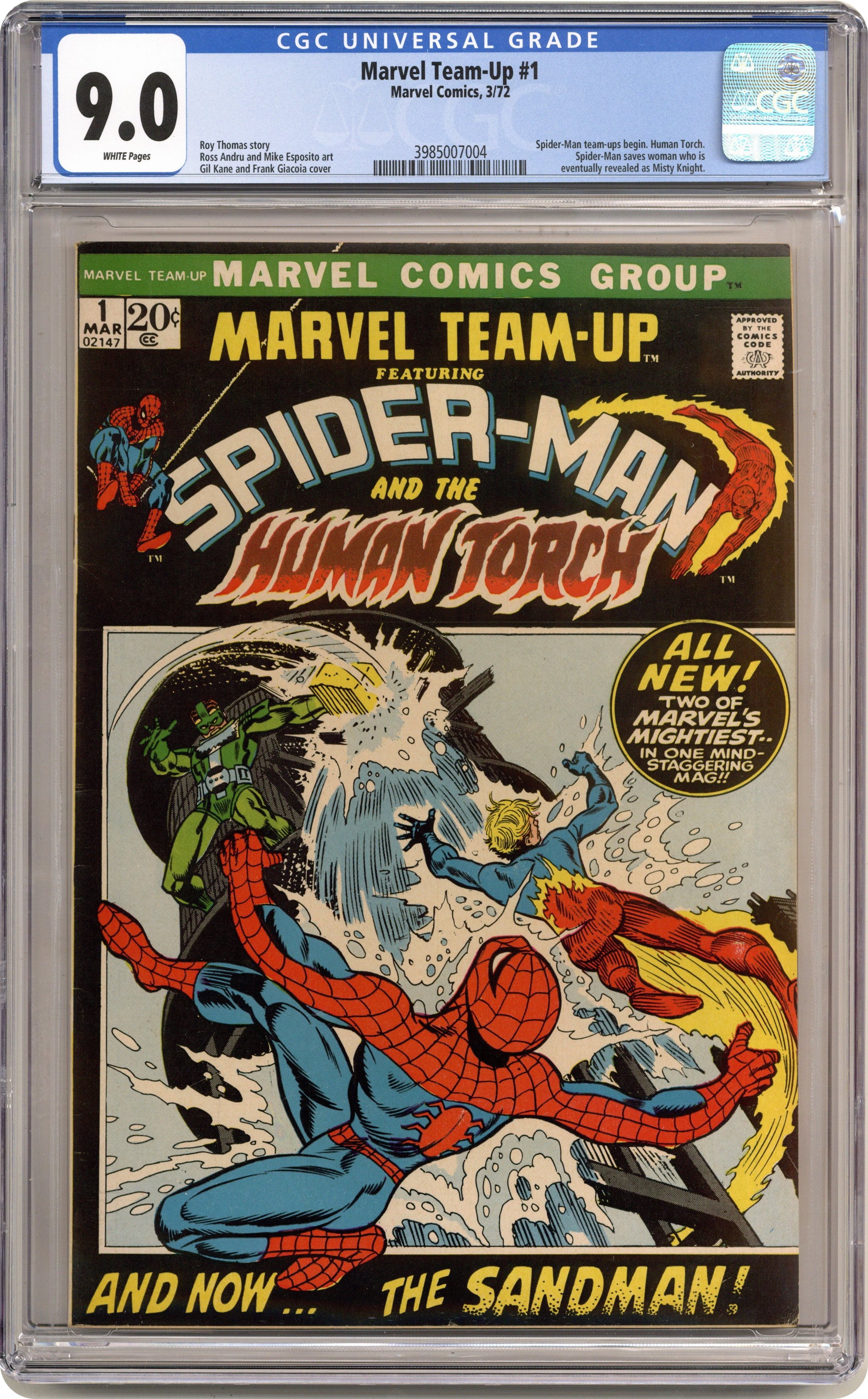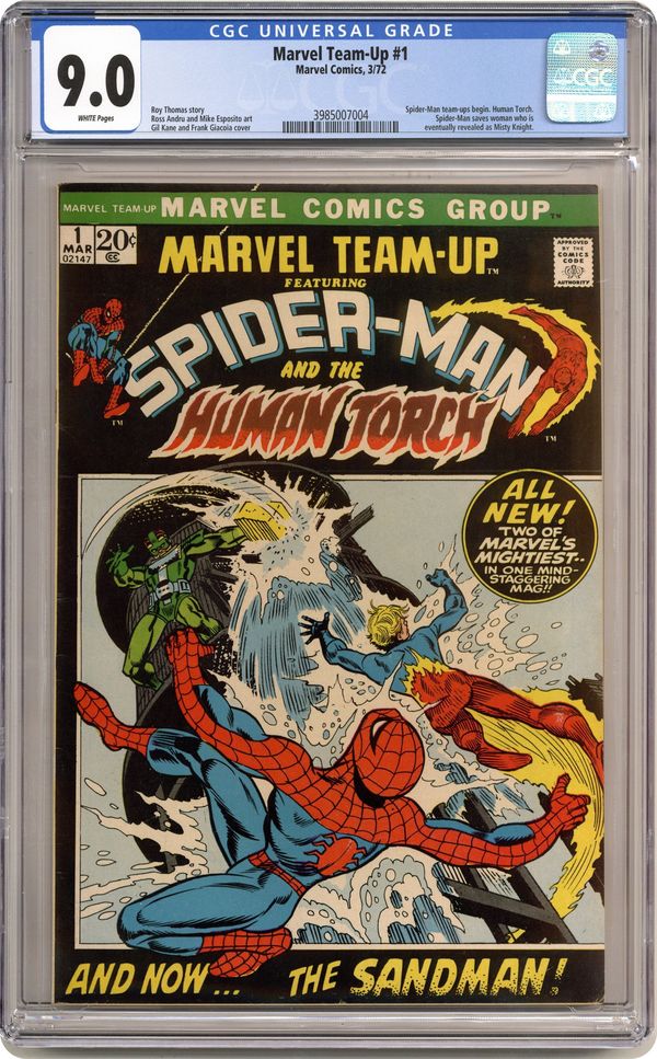 "Have Yourself a Sandman Little Christmas!" Guest-starring Spider-Man and the Human Torch. Script by Roy Thomas. Pencils by Ross Andru. Inks by Mike Esposito. Cover by Gil Kane and Frank Giacoia. A second monthly series for the Amazing Spider-Man begins with a team-up with his friendly rival in the Fantastic Four! After bumping into the Sandman on a New York beach, the web-slinger rushes to the Baxter Building! Only Johnny Storm is home on Christmas Eve, and he agrees to help Spider-Man track down the Sandman. The wall-crawler and the torch locate their foe in New Jersey, and the breakneck battle begins! Will Spider-Man and the Human Torch go easy on the Sandman? 'Tis the season! First appearance of Misty Knight (unnamed in the story). (Notes: The Marvel Team-Up title is published bi-monthly thru issue #7. Amazing Spider-Man (1st series) 106 is also published this month. This story was reprinted in 1974 in the Marvel Treasury Special - Superhero Holiday Grab Bag.) 36 pages. Cover price $0.20. Grade: CGC 9.0 explanation of grade Condition: Used (collectible)