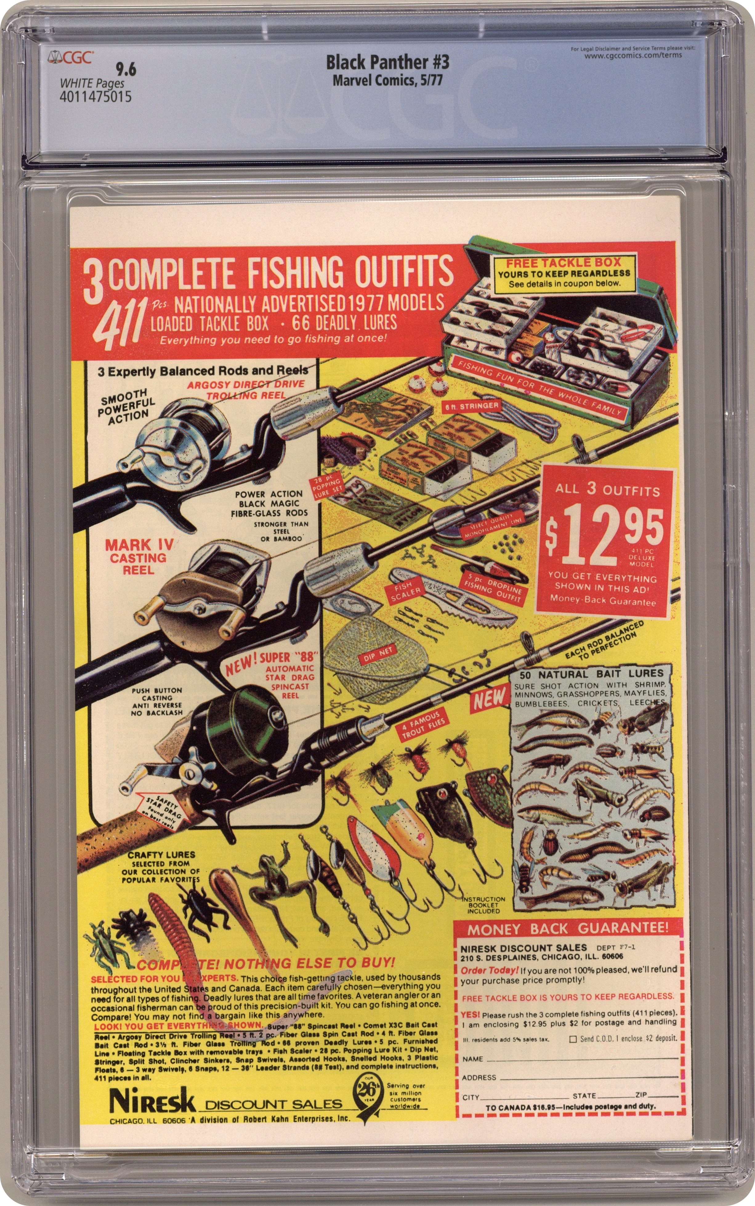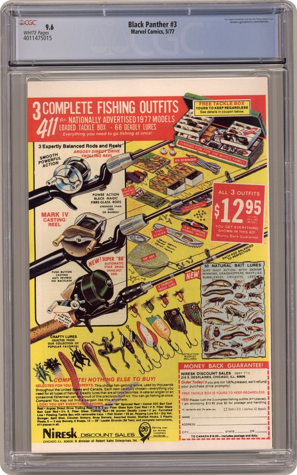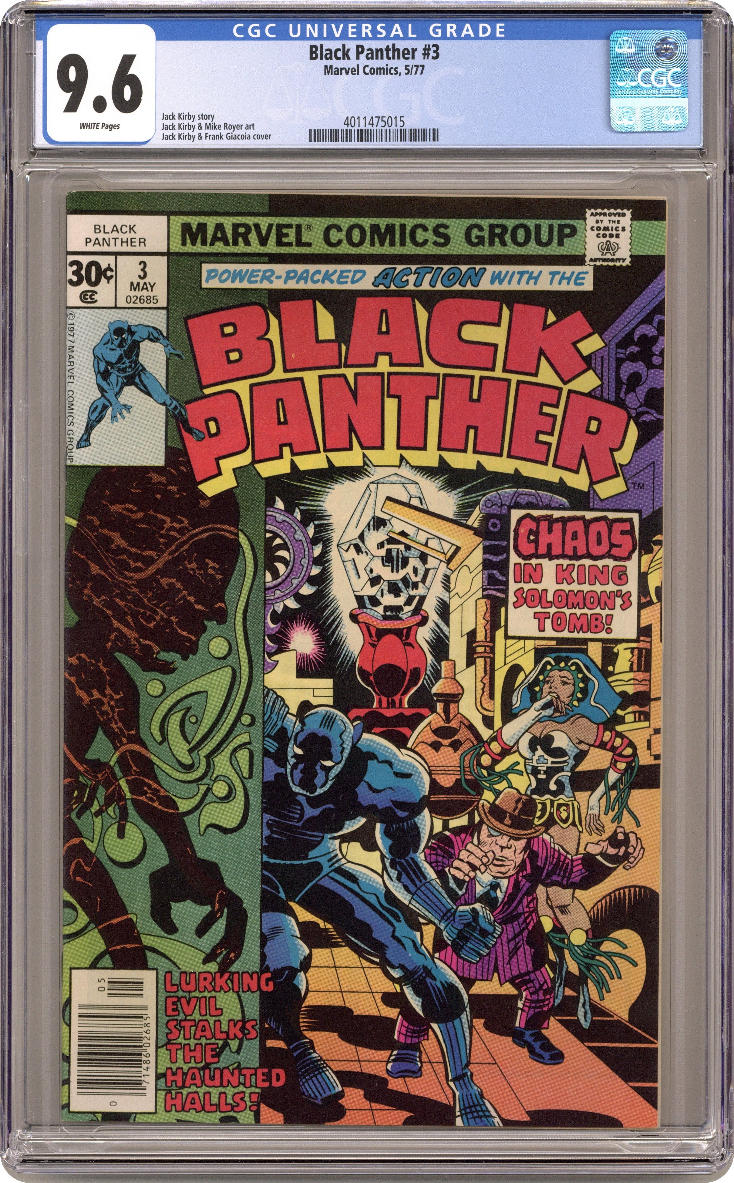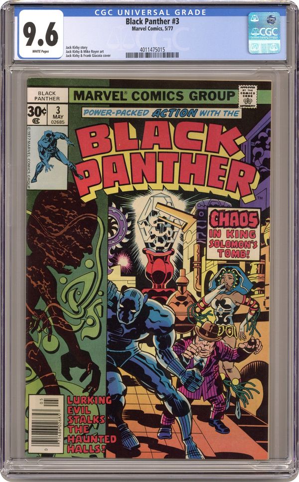 Cover pencils by Jack Kirby, inks by John Verpoorten. Race Against Time, script and pencils by Jack Kirby, inks by Mike Royer; Black Panther, Abner Little and Princess Zanda survive the perils of King Solomon's tomb to find the second Brass Frog; With the two Frogs connected, the ancient time machine is complete and the Panther is able to send Hatch-22 back to his own time in the future. 32 pgs. $0.30. Cover price $0.30. Grade: CGC 9.6 explanation of grade Condition: Used (collectible)
